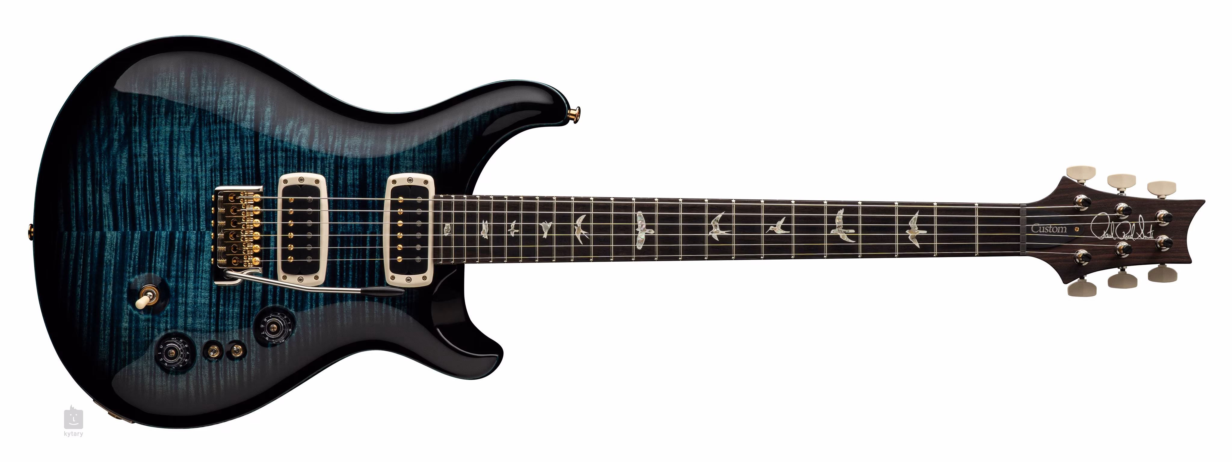 Model Custom 24-08 Cobalt Smokeburst na prvý pohľad zaujme kombináciou ergonomicky tvarovaného mahagónového tela s typickým PRS dvojitým výrezom a figúrovanou vrchnou doskou z javora s chladnou kresbou dreva. Jednodielny mahagónový krk s profilom Pattern Thin je prilepený k palisandrovému hmatníku osadenému dvadsiatimi štyrmi pražcami. Orientáciu na hmatníku uľahčujú značkové PRS pozičné značky v podobe perleťových siluet vtákov.