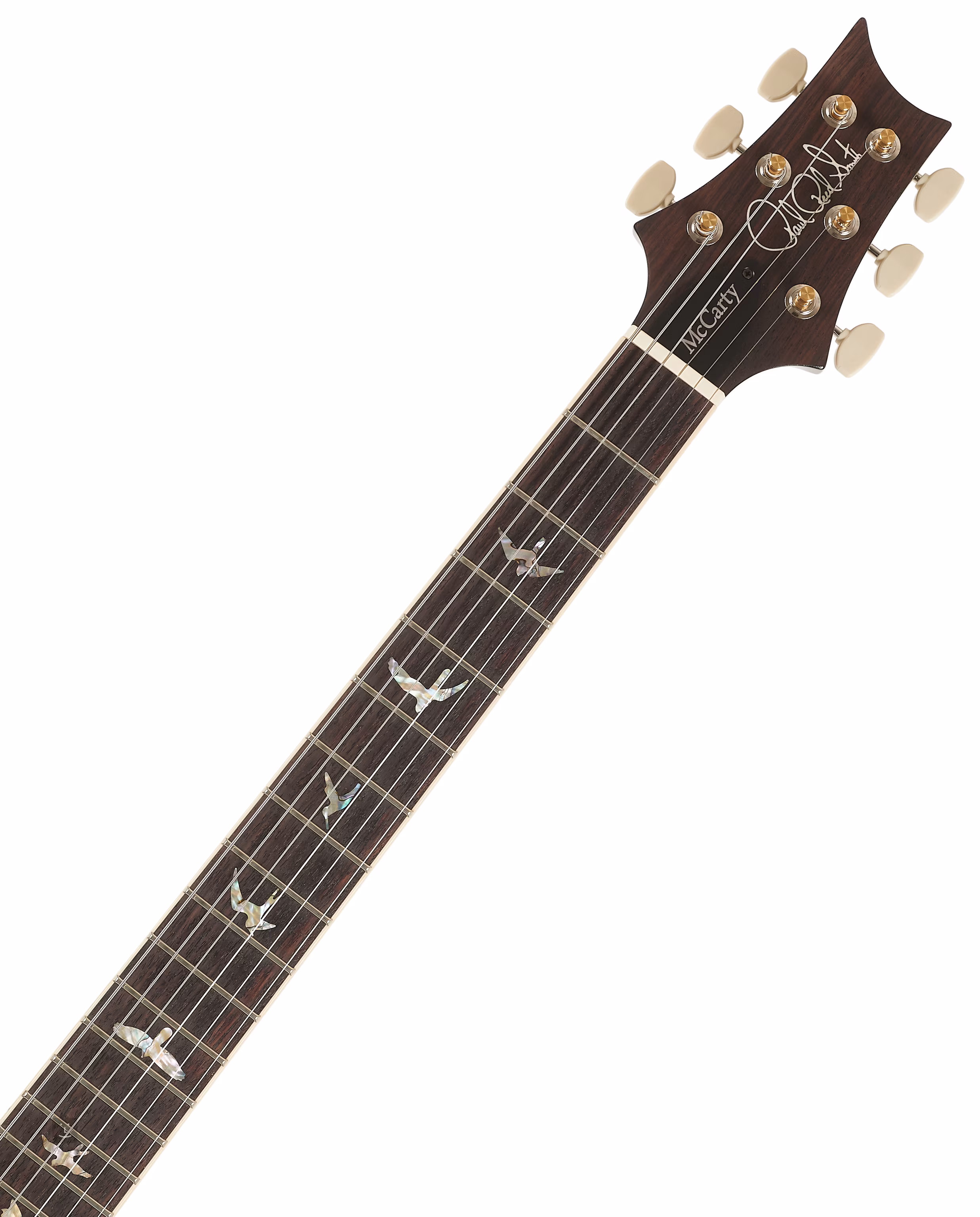 Elektrická gitara McCarty Gray Black 58/15 je nástroj s dušou vintage gitár, tradičným dizajnom tela PRS a skvelými hernými vlastnosťami. Je vybavená o niečo plnším ergonomicky tvarovaným mahagónovým telom so širšou zadnou doskou a efektnou figúrovanou javorovou vrchnou doskou. K mahagónovému krku s profilom Pattern je prilepený palisandrový hmatník osadený dvadsiatimi dvoma pražcami. Orientáciu na hmatníku uľahčujú značkové PRS pozičné značky v podobe luxusných perleťových siluet vtákov.