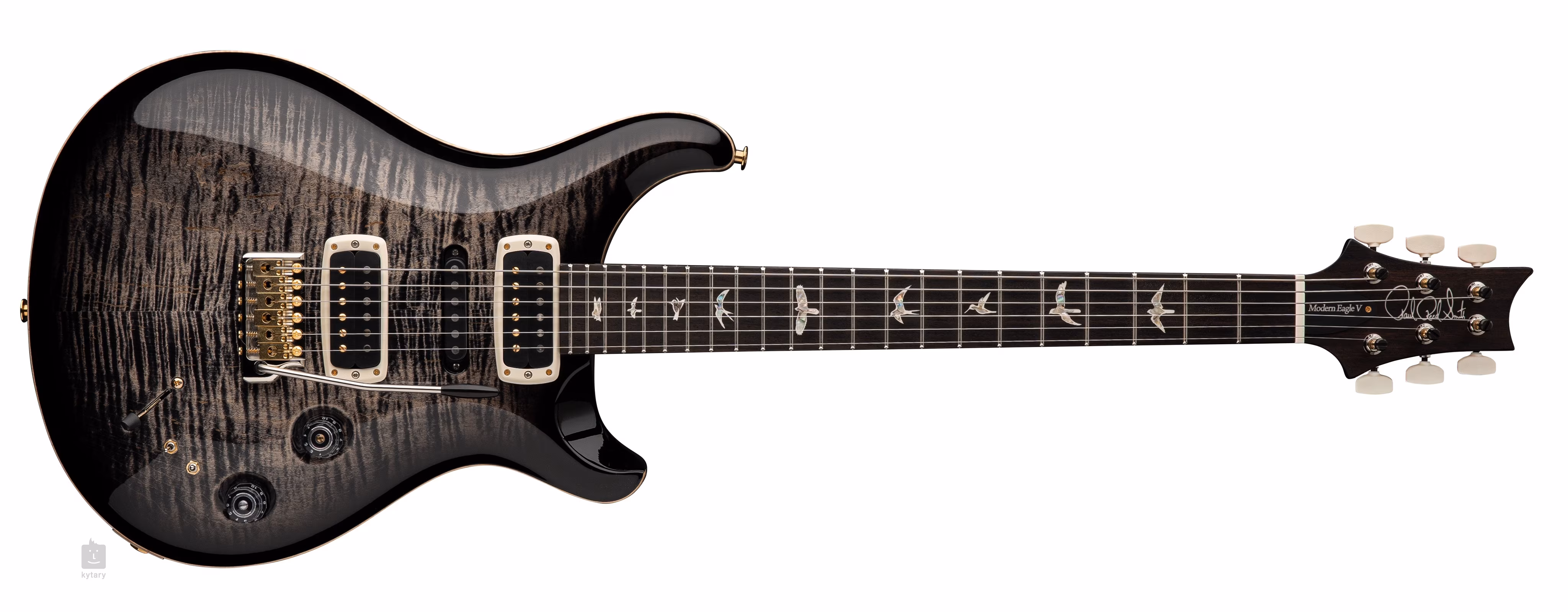 PRS Modern Eagle V je moderná elektrická gitara v dizajne PRS s dvojitým výrezom a konfiguráciou snímačov H-S-H, ktorú oceníte v štúdiu aj na pódiu. Ergonomicky tvarované mahagónové telo Modern Eagle V Charcoal Burst zdobí figúrovaná javorová vrchná doska a lesklý nitrolak. Jednodielny mahagónový krk s profilom Pattern je prilepený k palisandrovému hmatníku osadenému dvadsiatimi dvoma pražcami. Orientáciu na hmatníku uľahčujú značkové PRS pozičné značky v podobe luxusných perleťových siluet vtákov.