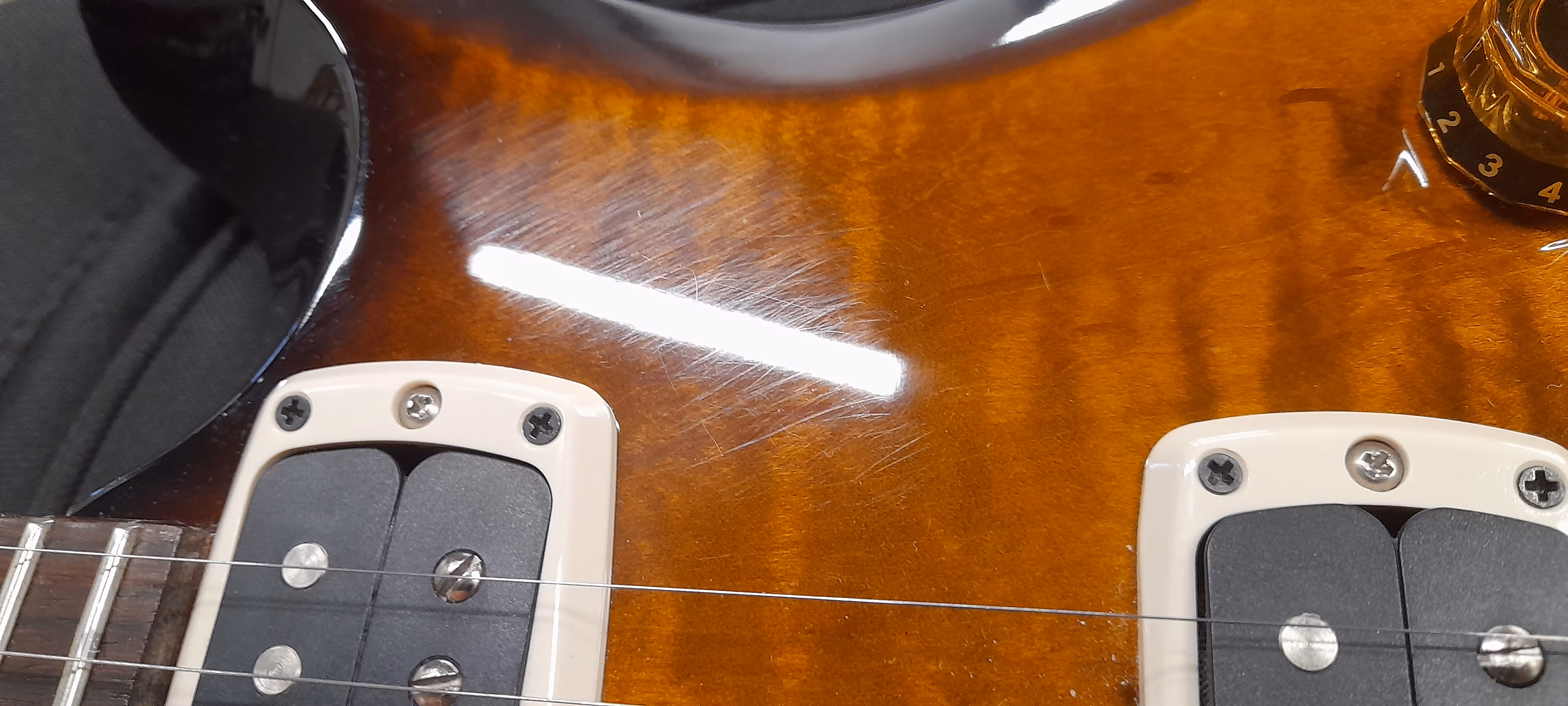 Mahagónové telo gitary S2 Custom 24-08 Black Amber s charakteristickým dizajnom PRS s dvojitým výrezom zdobí efektná vrchná doska z fládrovaného javora a lesklý lak. Výrazne skosené hrany tela podporujú celkovú ergonómiu hry. K mahagónovému krku s profilom Pattern Thin je prilepený palisandrový hmatník s dvadsiatimi štyrmi pražcami. Polohové značky v podobe perleťových siluet vtákov uľahčujú orientáciu po ploche hmatníka.