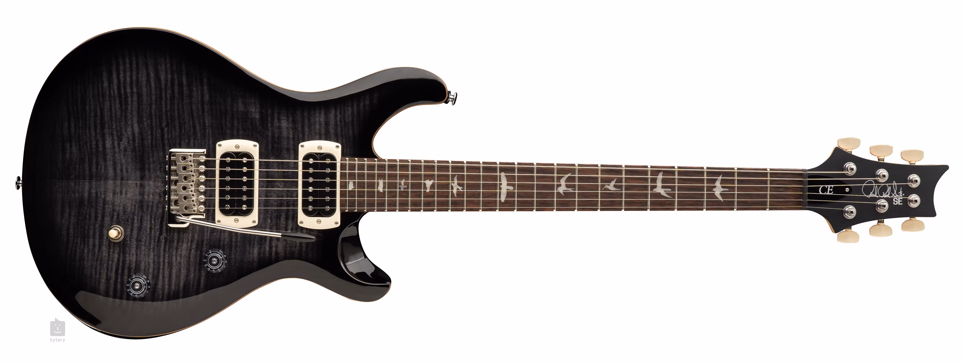 Mahagónové telo gitary SE CE24 Charcoal Burst zdobí impozantná vrchná doska z plamenného javora. Vďaka vyrezávaniu Shallow Violin sa hracie vlastnosti nástroja približujú drahším americkým modelom zo série Core. Javorový krk s profilom Wide Thin je vybavený palisandrovým hmatníkom s dvadsiatimi štyrmi pražcami. Pozícia značiek v podobe siluet vtákov uľahčuje orientáciu na hmatníku.