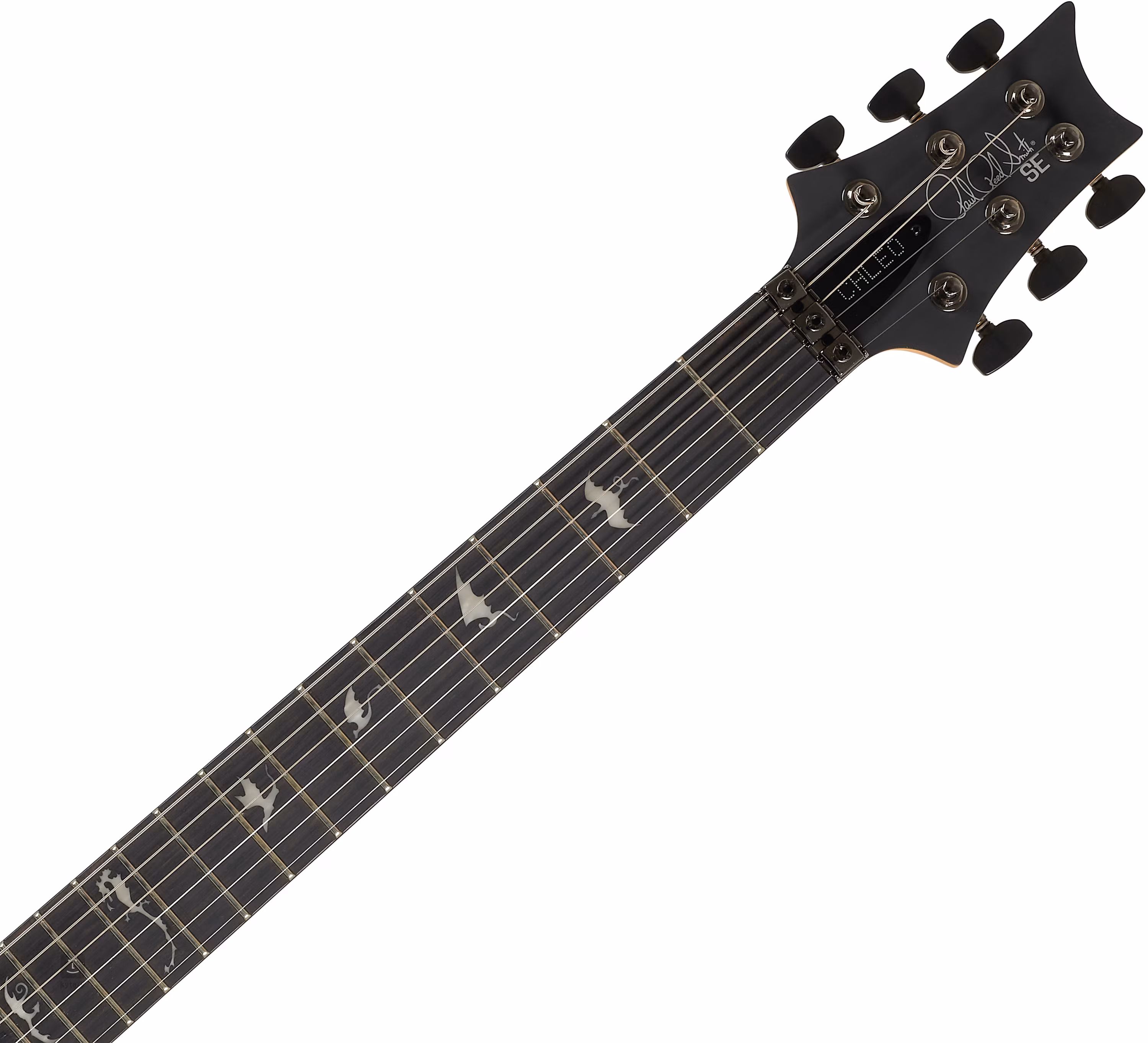 Mahagónové telo elektrickej gitary SE Chleo Charcoal Purple Burst zdobí kontúrovaná javorová vrchná doska a dyha z plamenného javora. Úzky, rýchly javorový krk je vybavený ebenovým hmatníkom s dvadsiatimi štyrmi pražcami. Krk je vystužený uhlíkovými vláknami a hmatník je zdobený značkami polohy „Eclipse Dragon“.