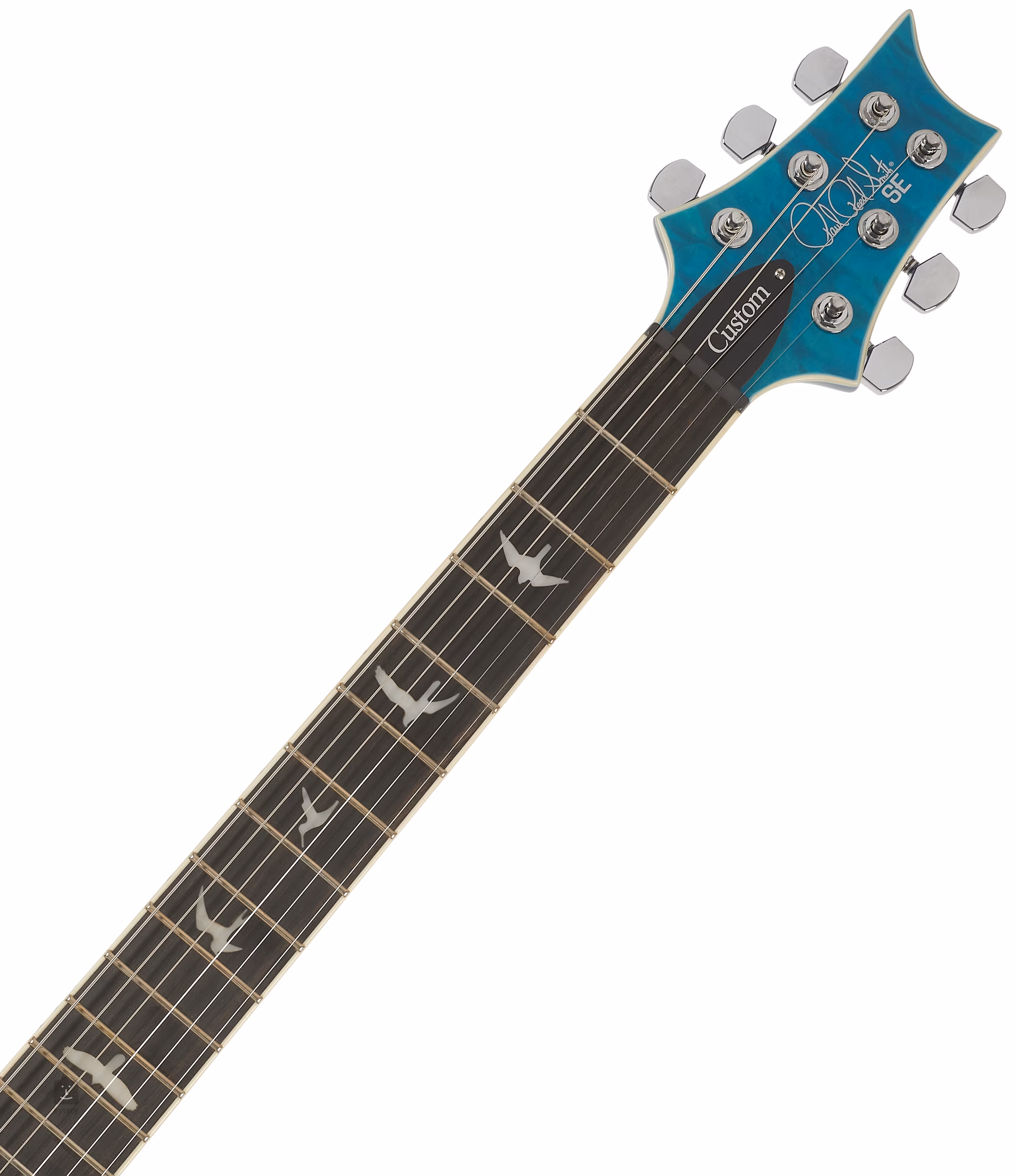 Mahagónové telo gitary SE Custom 24-08 Quilt Package Lake Blue zdobí javorová vrchná doska a efektná vrchná doska s dyhou z pufovaného javora. Vyrezávanie Shallow Violin približuje kvalitu hry nástroja drahším modelom americkej série Core. Javorový krk s profilom Wide Thin je prilepený k ebenovému hmatníku osadenému dvadsiatimi štyrmi pražcami. Orientáciu na hmatníku uľahčujú polohové značky v podobe perleťových siluet vtákov.