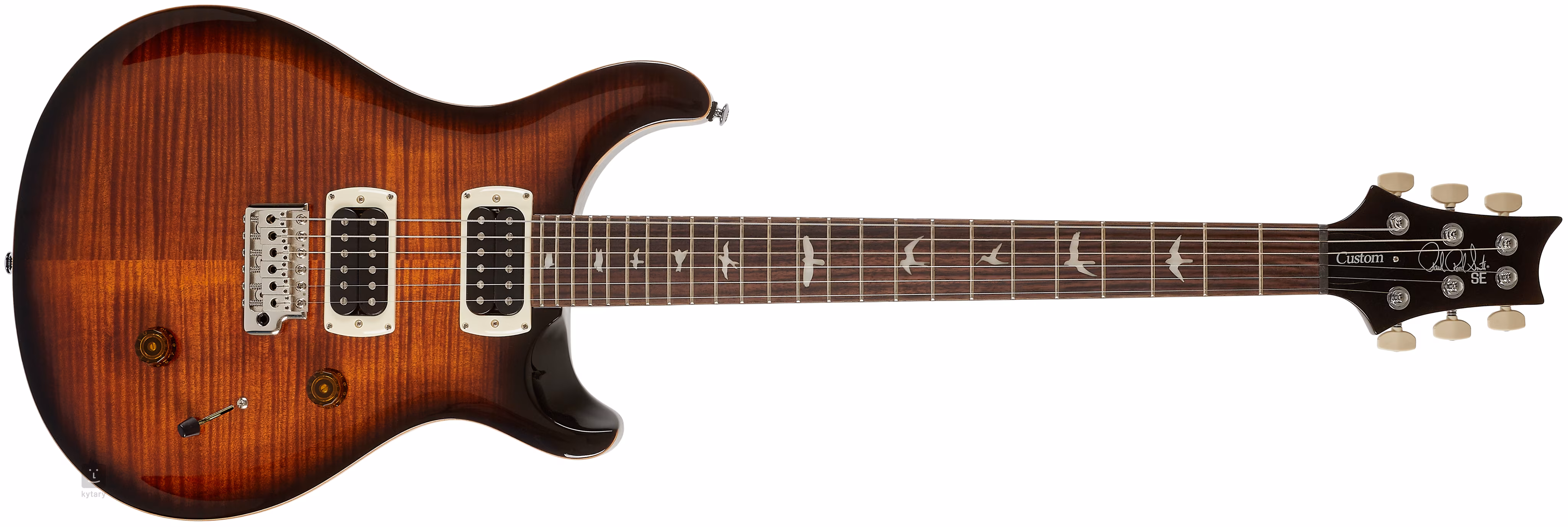 Mahagónové telo modelu SE Custom 24 Black Gold Sunburst 2026 zdobí javorová vrchná doska a impozantná dyha z plamenného javora. Výrez Shallow Violin carve približuje hracie vlastnosti nástroja drahším americkým modelom zo série Core. Javorový krk s profilom Wide Thin je vybavený palisandrovým hmatníkom s dvadsiatimi štyrmi pražcami. Polohové značky v podobe siluet vtákov uľahčujú orientáciu na hmatníku.