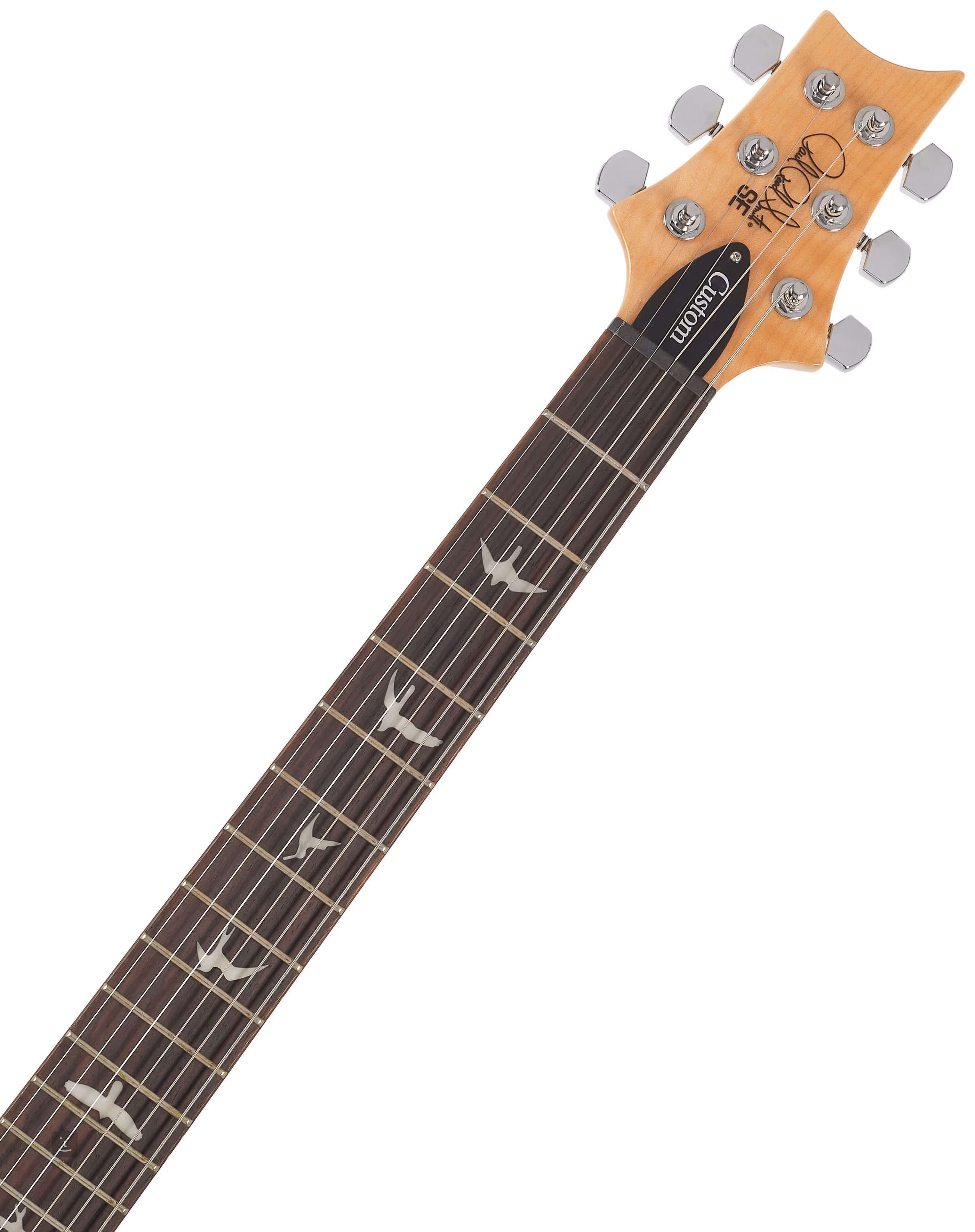 Mahagónové telo gitary SE LEFTY CUSTOM 24 Turquiose pre ľavorukých hráčov zdobí javorová vrchná doska a efektná dyha z dyhovaného javora. Vyrezávanie Shallow Violin približuje kvalitu hry nástroja drahším modelom americkej série Core. Palisandrový hmatník s dvadsiatimi štyrmi pražcami je prilepený k javorovému krku s profilom Wide Thin. Polohové značky v podobe perleťových siluet vtákov uľahčujú orientáciu na povrchu hmatníka.