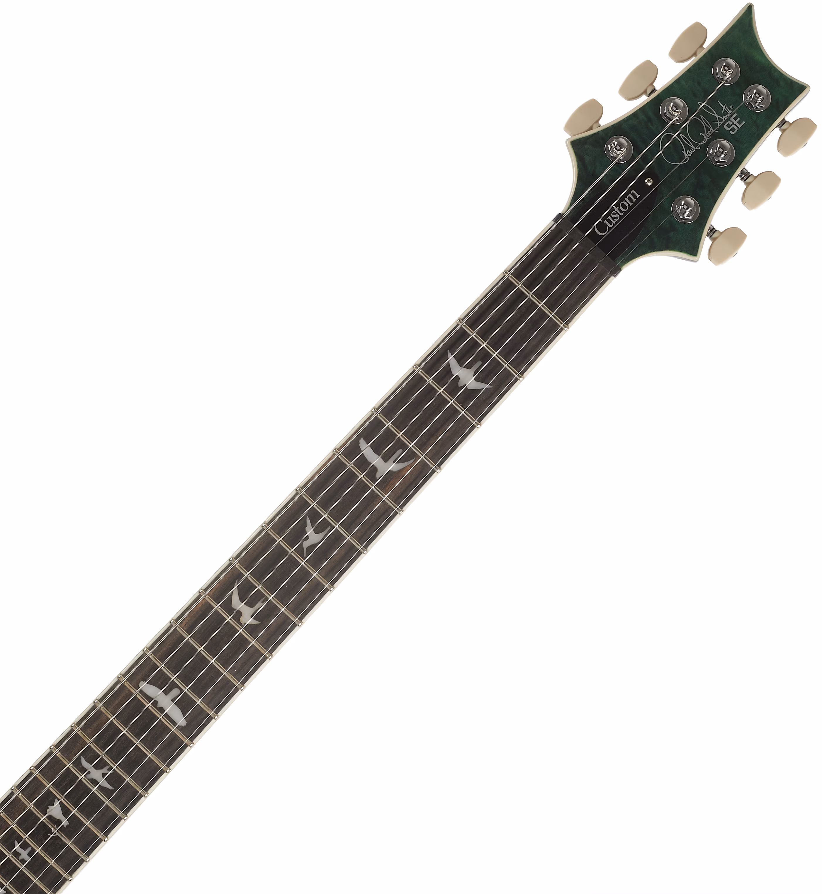 Mahagónové telo modelu SE Custom 24 Quilt Package Teal Black 2026 zdobí javorová vrchná doska a nápadná dyha z obláčkového javora. Výrez Shallow Violin carve približuje hracie vlastnosti nástroja drahším americkým modelom zo série Core. Javorový krk s profilom Wide Thin je vybavený ebenovým hmatníkom s dvadsiatimi štyrmi pražcami. Polohové značky v podobe siluet vtákov uľahčujú orientáciu na hmatníku.