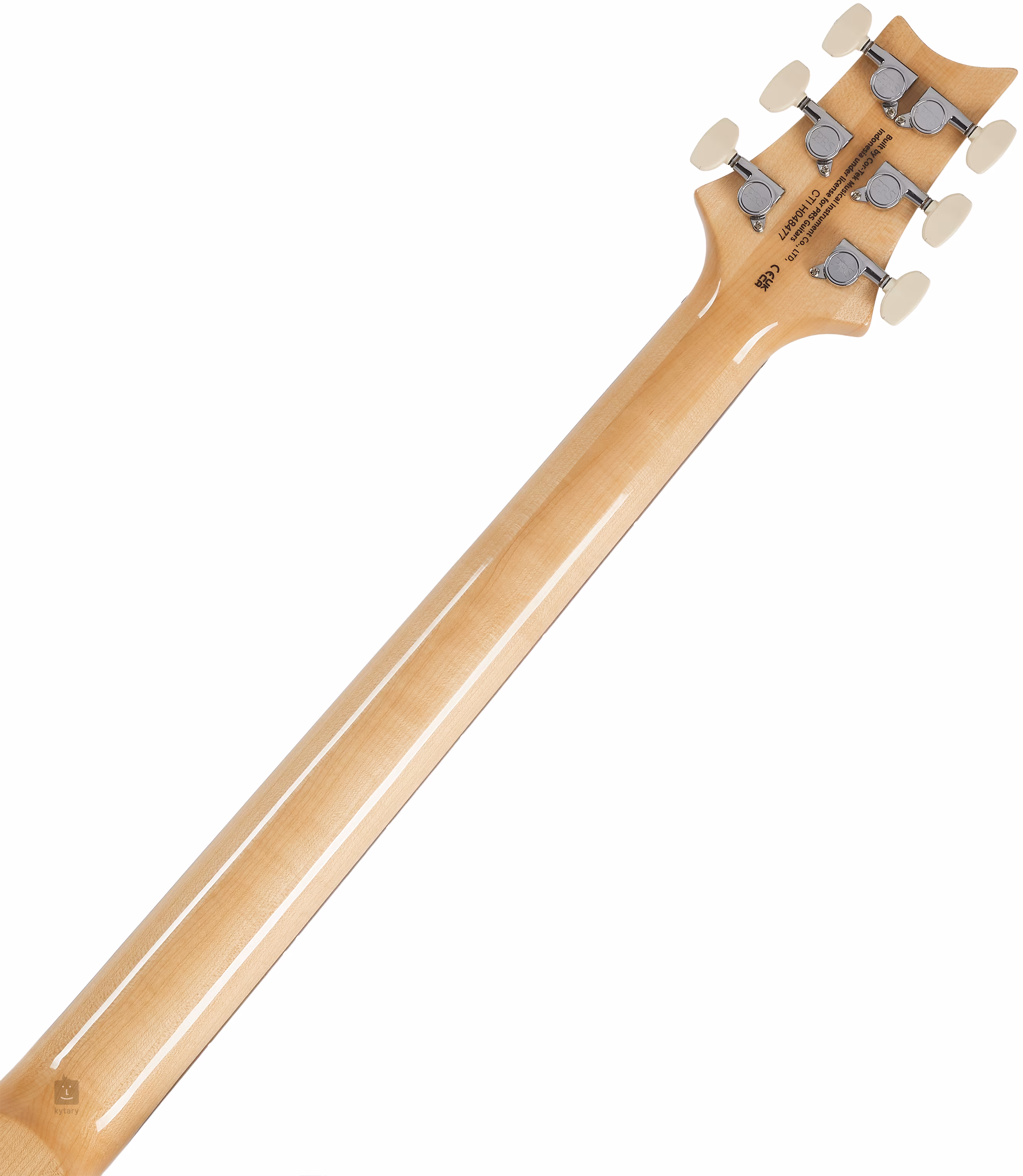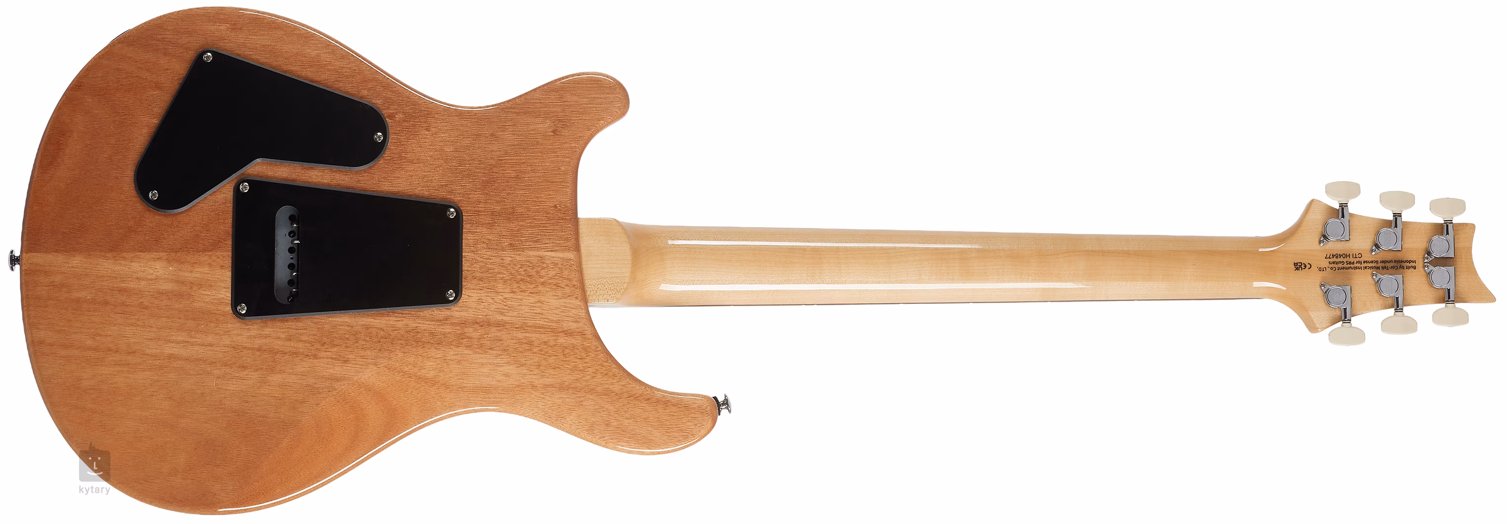 Mahagónové telo gitary SE Custom 24 Slate Blue 2026 je zdobené javorovou vrchnou doskou a impozantnou dyhou z plamenného javora. Výrez Shallow Violin carve približuje hracie vlastnosti nástroja k drahším americkým modelom zo série Core. Javorový krk s profilom Wide Thin je prilepený k palisandrovému hmatníku s dvadsiatimi štyrmi pražcami. Polohové značky v podobe siluet vtákov uľahčujú orientáciu na hmatníku.