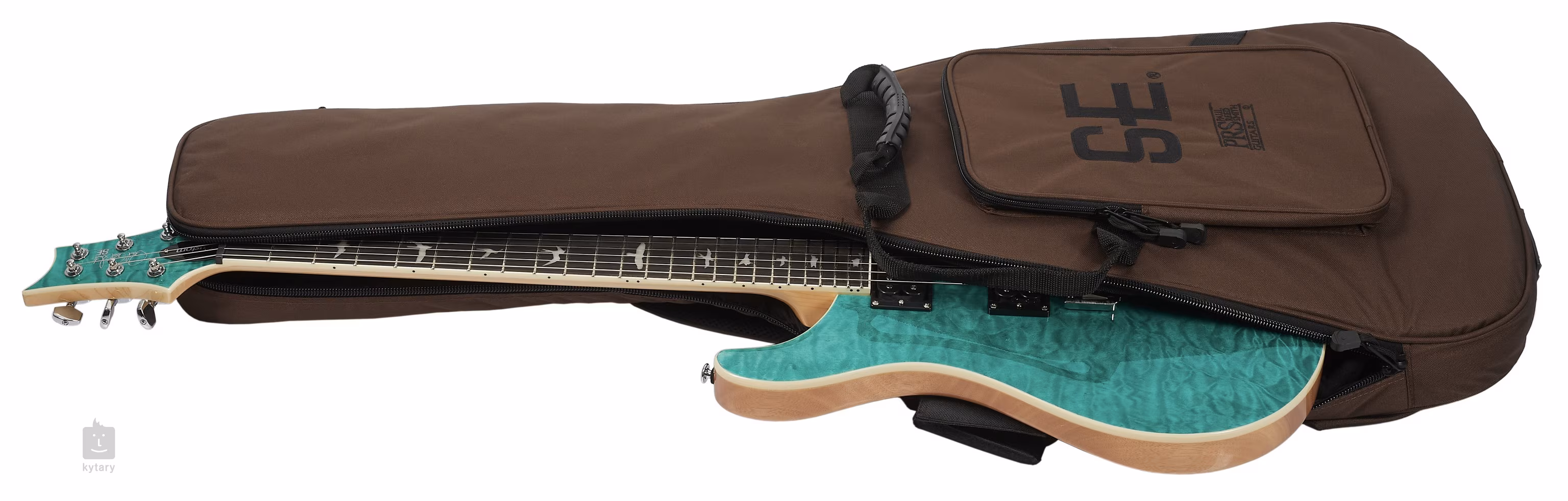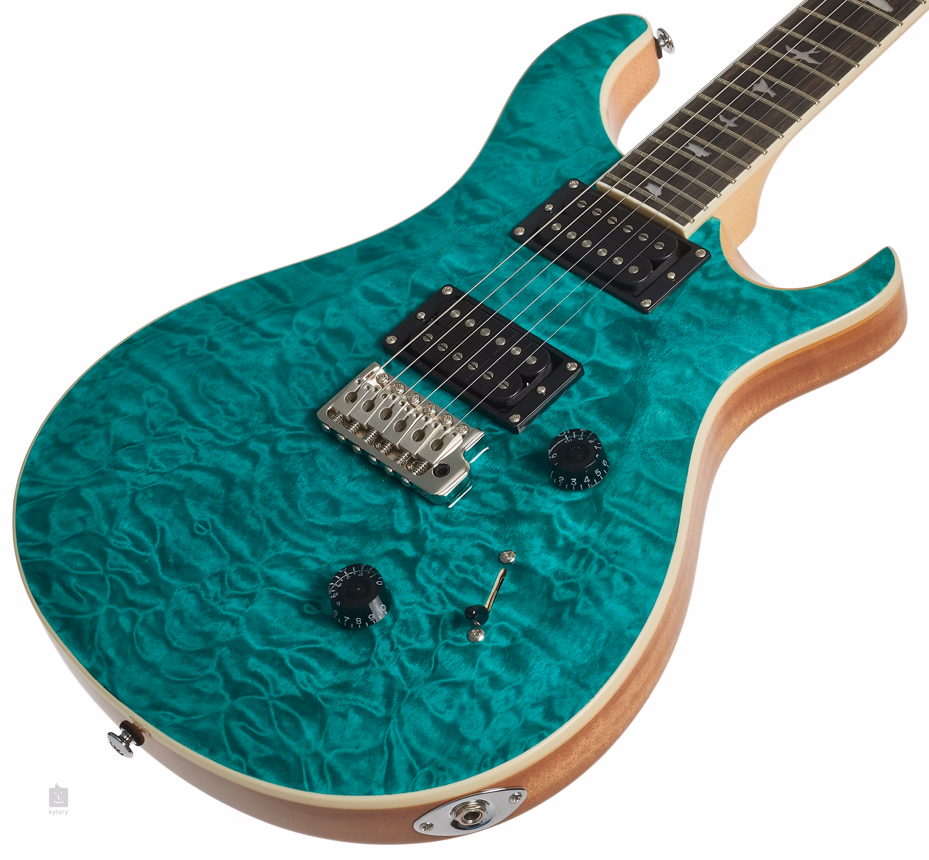 Mahagónové telo gitary SE Custom 24 Quilt Package Turquiose zdobí javorová vrchná doska a efektná vrchná doska z javorovej dyhy Cloud, ktorá je použitá aj na hlavici. Vyrezávanie Shallow Violin približuje hrateľnosť nástroja kvalitou drahším modelom americkej série Core. Ebenový hmatník osadený dvadsiatimi štyrmi pražcami je prilepený k javorovému krku s profilom Wide Thin. Orientáciu na hmatníku uľahčujú polohové značky v podobe perleťových siluet vtákov.