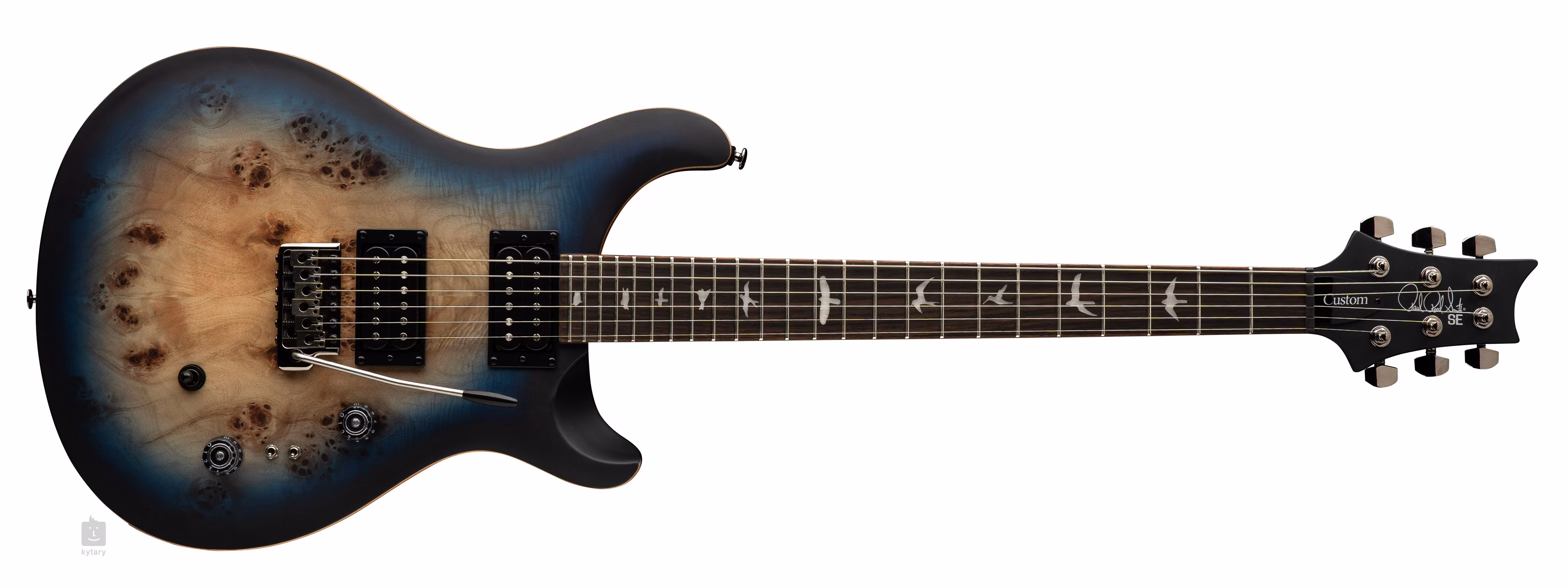 SE Exotic Custom 24-08 Poplar Burl Lake Blue Midnight Burst je pôsobivý model z edície 2025, limitovaný na 2500 kusov. Mahagónové telo gitary zdobí javorová vrchná doska a efektná vrchná dýha z topolu burl. Vyrezávanie Shallow Violin približuje kvalitu hry nástroja drahším modelom z americkej Core Series. Palisandrový hmatník s dvadsiatimi štyrmi pražcami je prilepený k javorovému krku s profilom Wide Thin. Orientáciu na hmatníku uľahčujú polohové značky v podobe perleťových siluet vtákov.