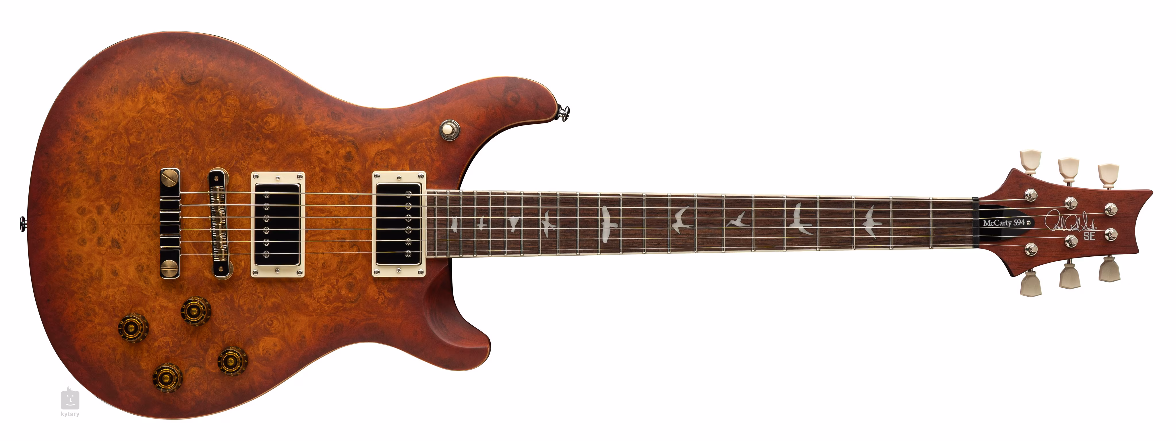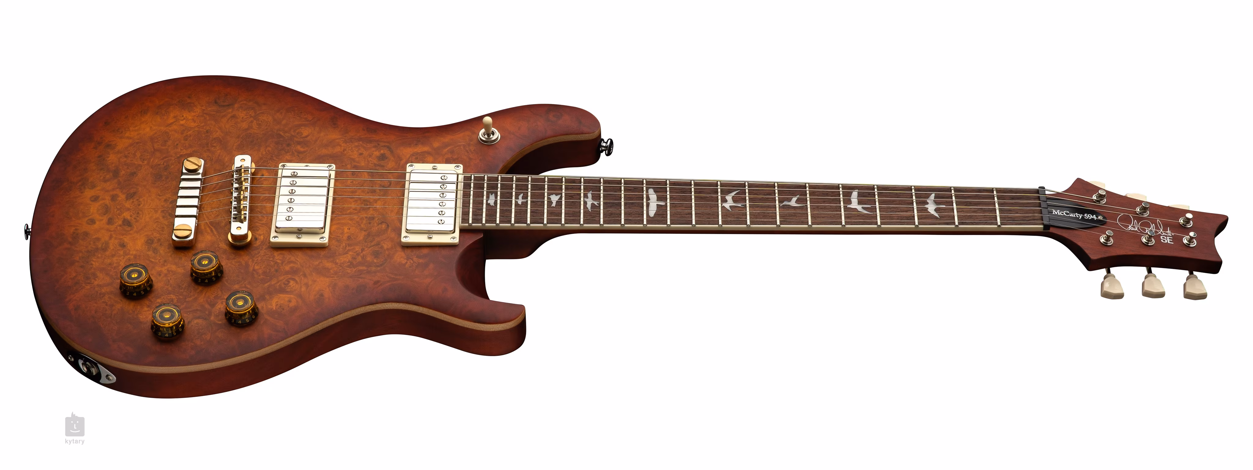 SE Exotic McCarty 594 Laurel Burl Vintage Sunburst je pôsobivý model z edície 2025, ktorá je limitovaná len na 500 kusov. Mahagónové telo gitary zdobí javorová vrchná doska a efektná dýha Laurel Burl. Vyrezávanie Shallow Violin približuje kvalitu hry nástroja k drahším modelom zo série American Core. Mahagónový krk s profilom Pattern Vintage je prilepený k palisandrovému hmatníku osadenému dvadsiatimi dvoma pražcami. Kratšia menzúra gitary (625 mm) je samozrejme stelesnená v označení modelu McCarty 594 (24,594 palca). Orientáciu na hmatníku uľahčujú polohové značky v podobe siluet vtákov.