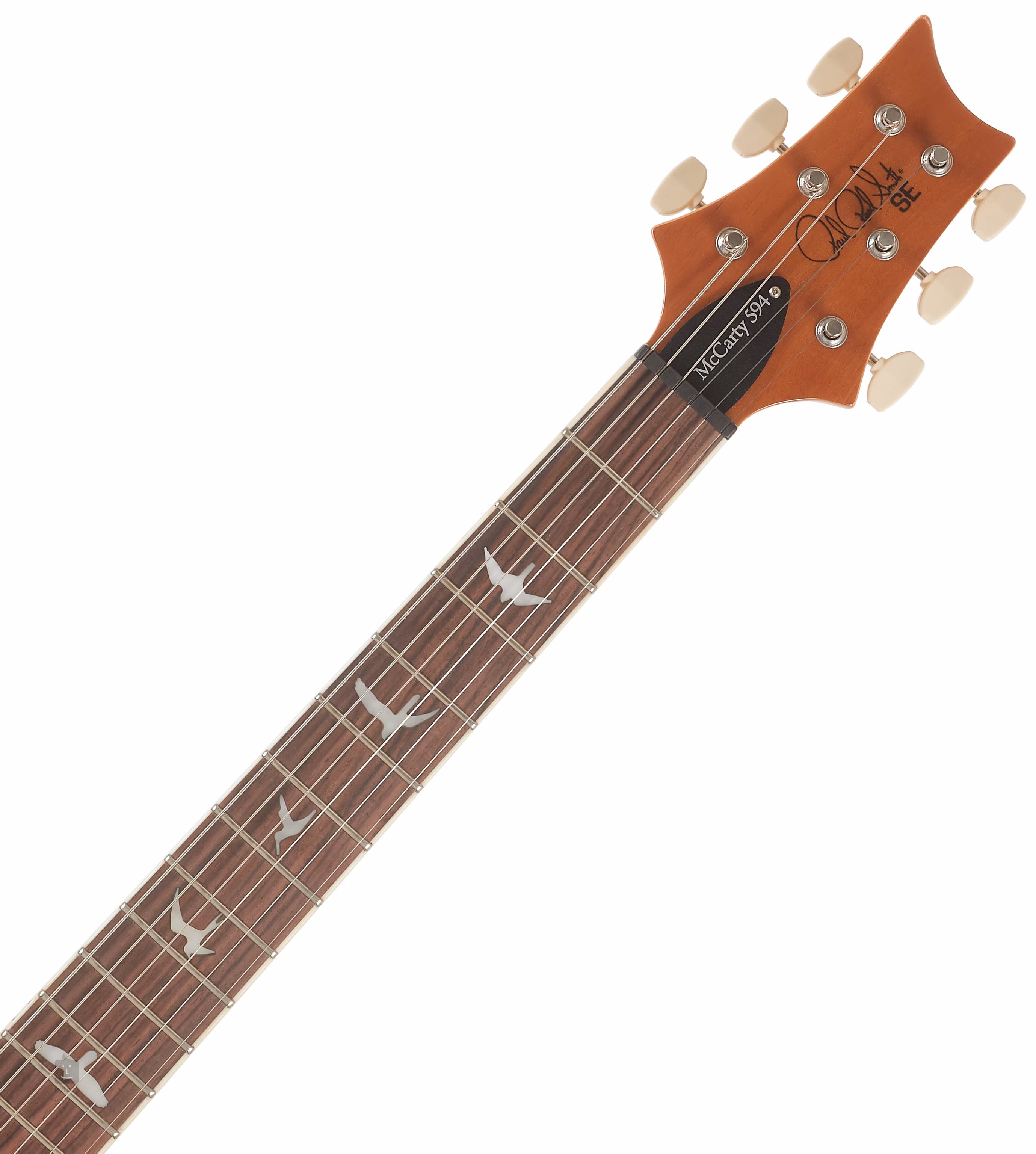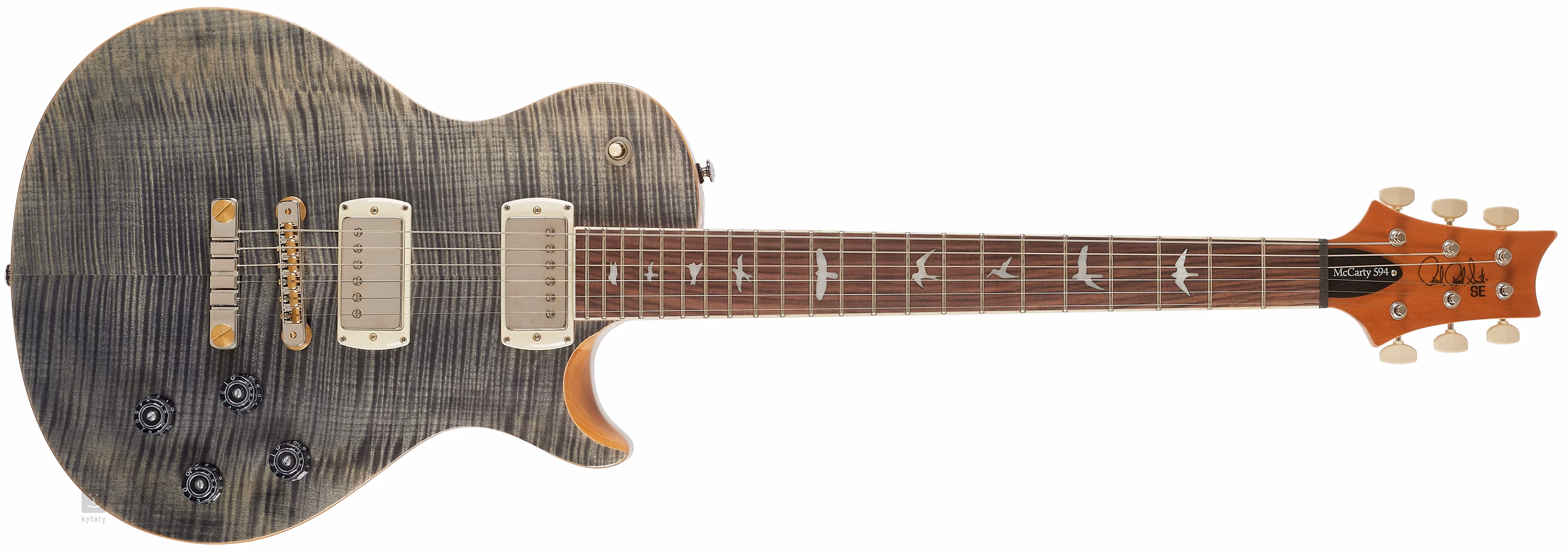 Mahagónové telo modelu SE McCarty 594 Singlecut Charcoal 2026 zdobí javorová vrchná doska a nápadná dyha z plamenného javora. Vďaka vyrezávaniu Shallow Violin sa hracie vlastnosti nástroja približujú drahším americkým modelom zo série Core. Mahagónový krk s profilom Pattern Vintage je vybavený palisandrovým hmatníkom s dvadsiatimi dvoma pražcami. Gitara má samozrejme kratšiu menzúru (625 mm), čo sa odráža v označení modelu McCarty 594 (24,594 palca). Orientáciu na hmatníku uľahčujú pozície v podobe siluet vtákov.