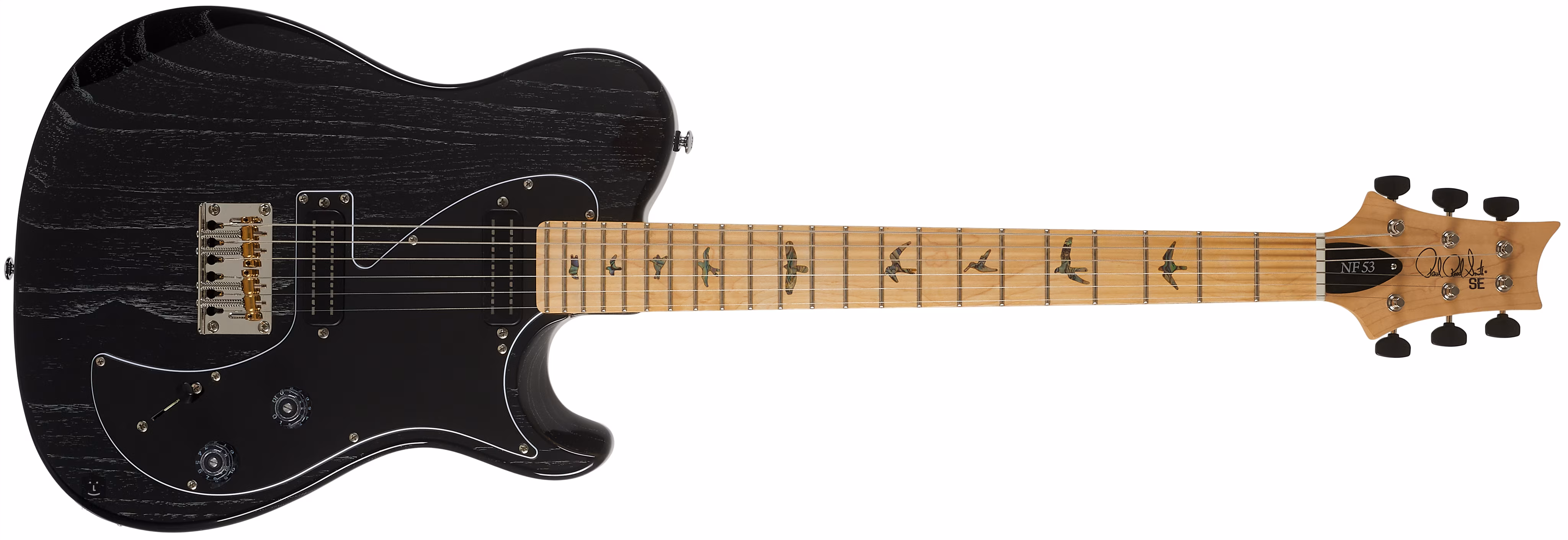 Telo elektrickej gitary SE NF 53 Black Doghair 2026 je vyrobené z jaseňa. Pohodlie pri hraní zabezpečuje prišraubovaný javorový krk, ktorý je v oblasti nultého pražca o niečo užší ako štandardný krk PRS. Orientáciu na javorovom hmatníku uľahčujú polohové značky v podobe siluet vtákov.