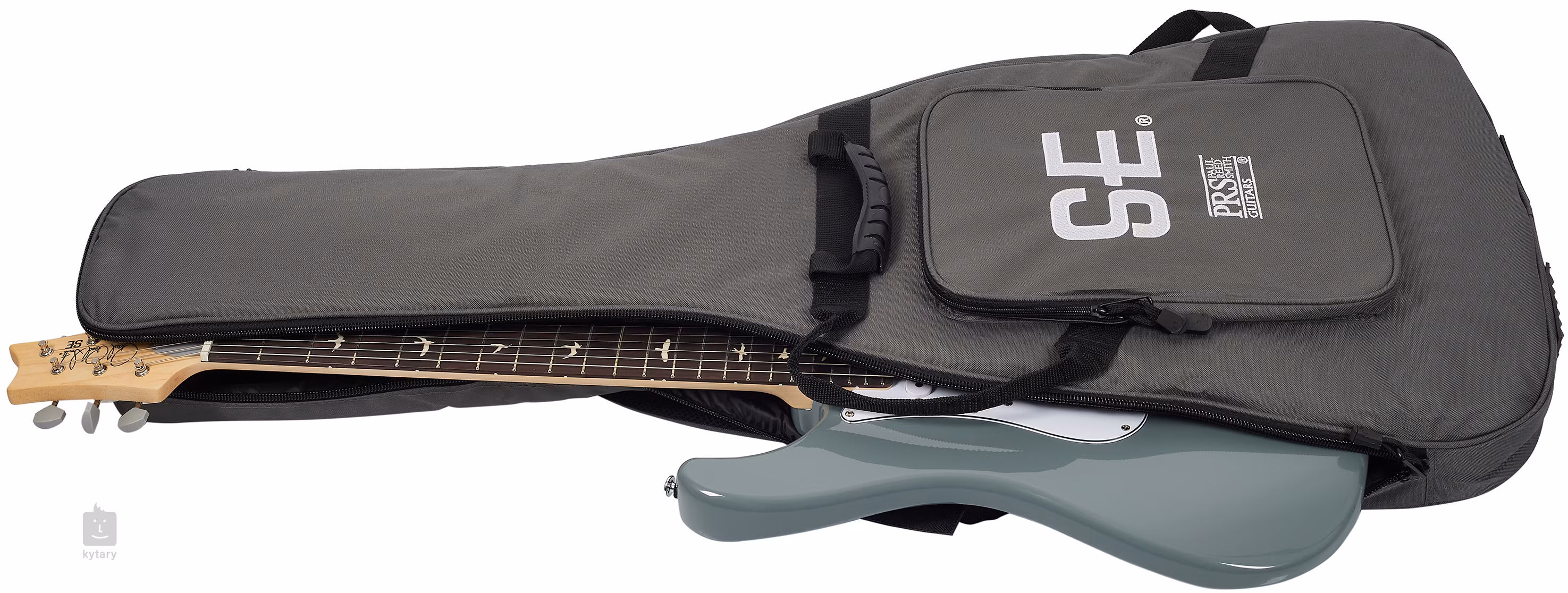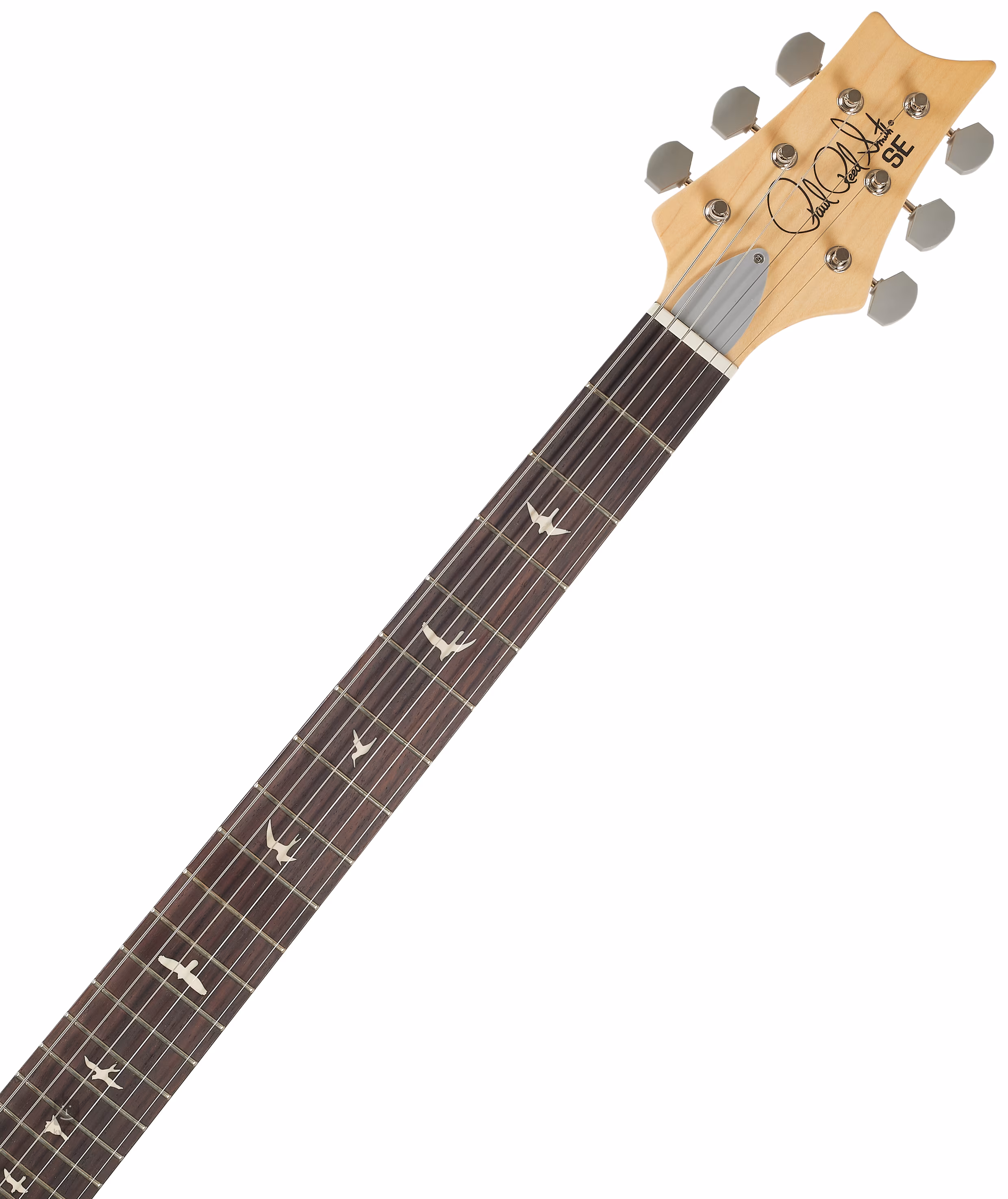 Telo gitary PRS SE Silver Sky Rosewood Storm Grey je vyrobené z topoľa. Na pripevnený javorový krk je prilepený palisandrový hmatník s dvadsiatimi dvoma pražcami. Krk ponúka originálny výrez/profil 635JM a orientáciu na hmatníku uľahčujú pozície v podobe siluet vtákov.