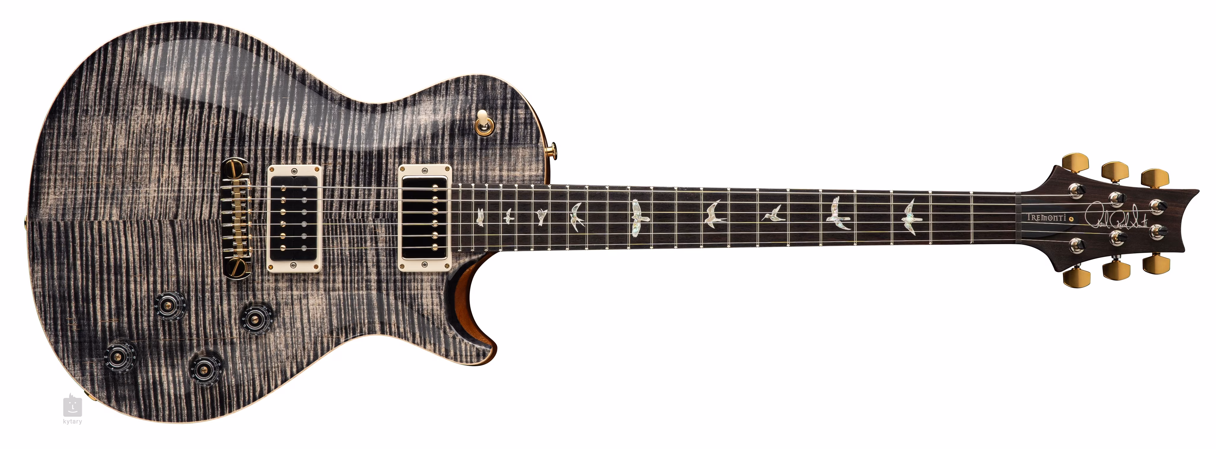 Jednorezná PRS Tremonti Stoptail Charcoal je signature modelom Marka Tremontiho, amerického gitaristu známeho z kapiel Creed a Alter Bridge. Ergonomicky tvarované mahagónové telo zdobí figúrovaný javorový top a lesklý nitro lak. Jednodielny mahagónový krk s profilom Pattern Thin je prilepený k palisandrovému hmatníku osadenému dvadsiatimi dvoma pražcami. Orientáciu na hmatníku uľahčujú značkové PRS pozičné značky v podobe luxusných perleťových siluet vtákov.