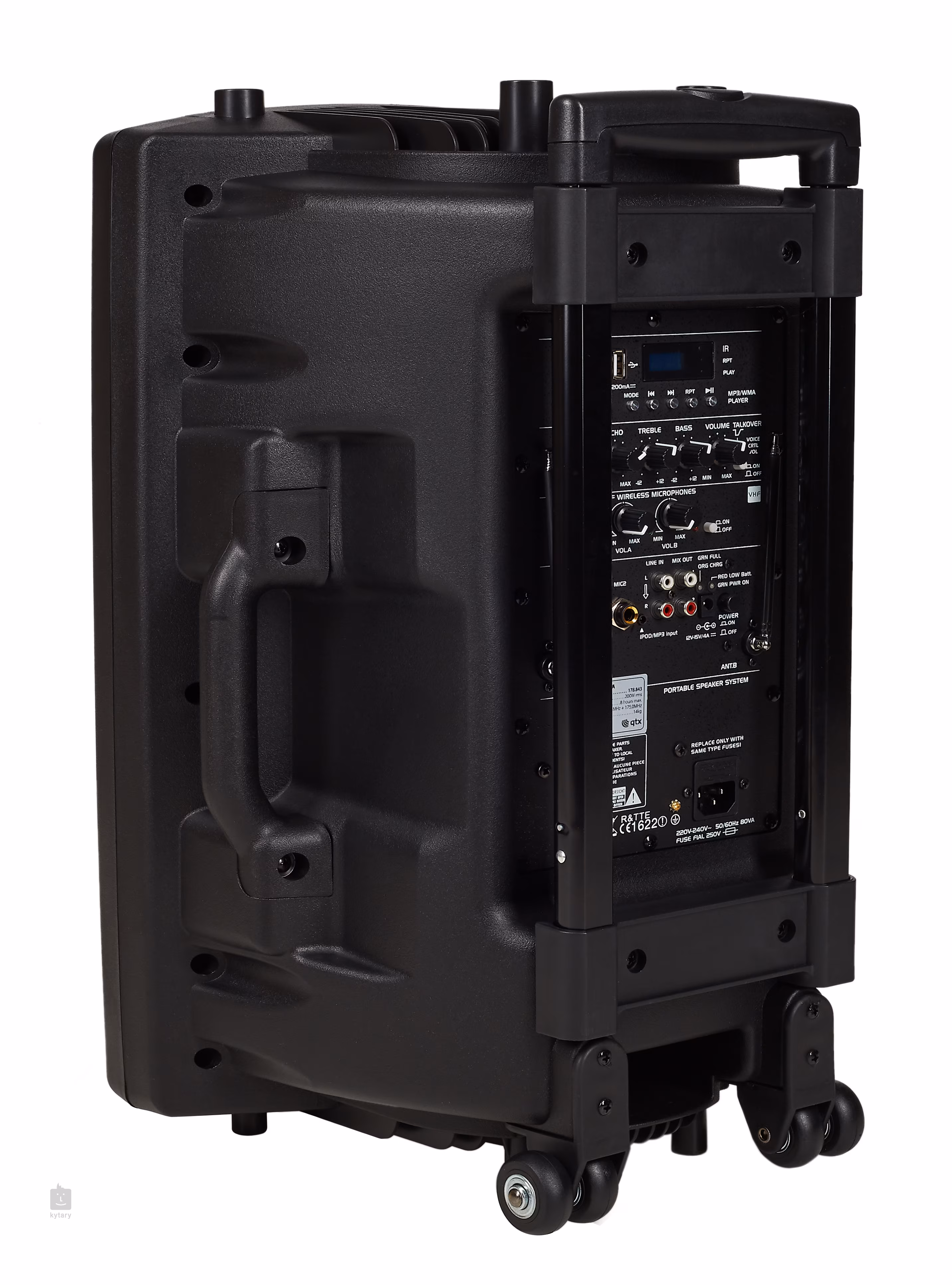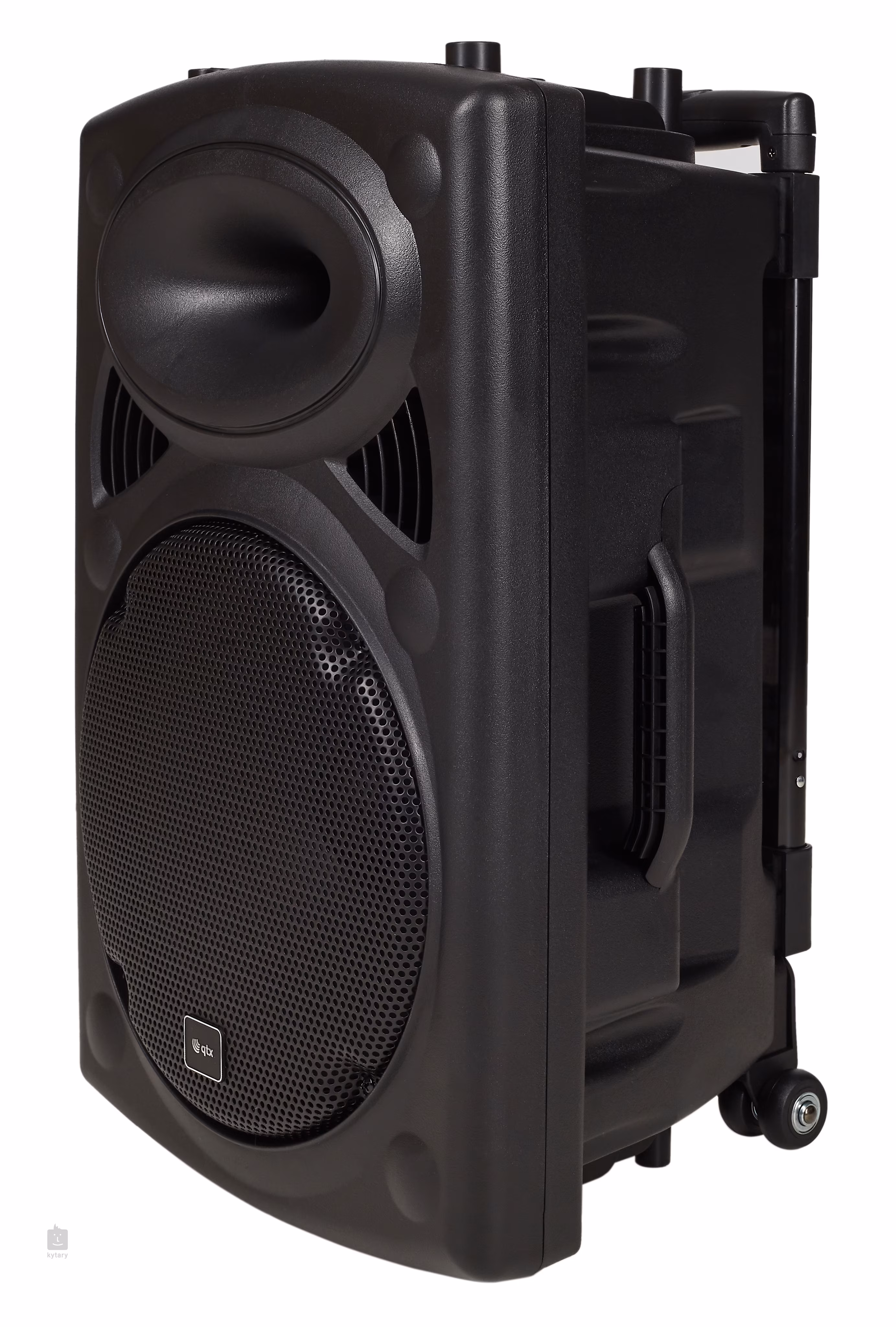 Prenosný reproduktorový systém PA 12" série QR. Vstavaný zosilňovač s výstupným výkonom 50 + 50 W RMS (LF + HF) napájaný zo siete alebo z interného akumulátora (až 8 hodín prevádzky na batérie). Obsahuje 2x ručné bezdrôtové mikrofóny VHF (frekvencia 174,1 MHz + 175,0 MHz), zabudovaný prijímač a zosilňovač na zadnej strane vrátane ovládacích prvkov (ovládanie hlasitosti, efekt Echo, korekcia basov a výšok a ovládanie úrovne vstupu bezdrôtového mikrofónu), 2 mikrofónové vstupy s efektom Echo. Vstupy: linkový (AUX) / USB / SD. Výsuvná rukoväť a kolieska na jednoduchú manipuláciu a prepravu. Napájanie: externé - 220/240 V AC, 50/60 Hz, interné - vstavaná 12V batéria.