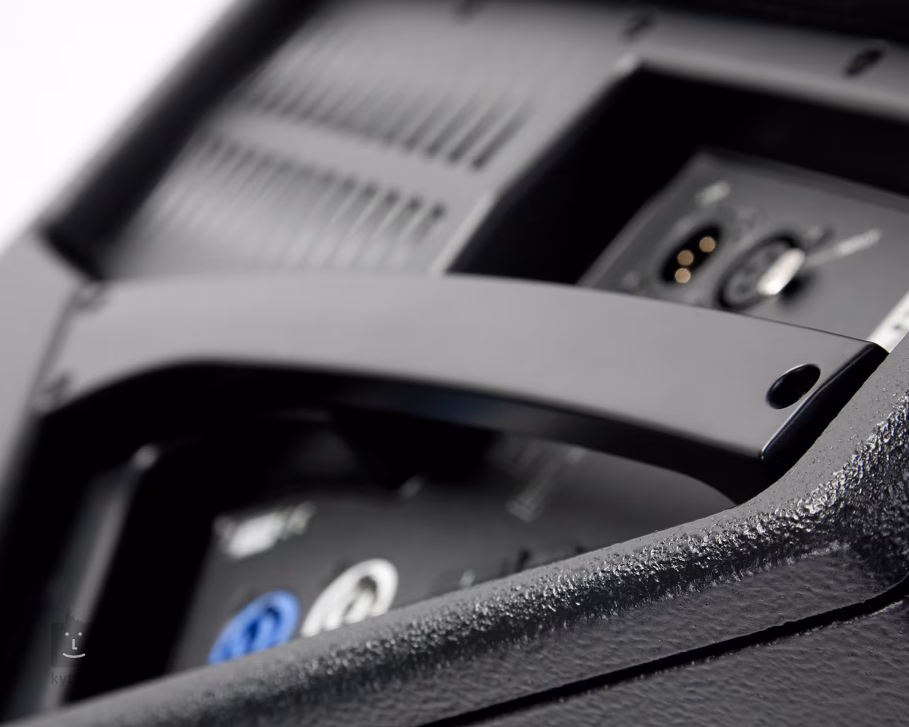 Rezonančná doska je vyrobená z baltickej brezovej preglejky a pred nepriaznivými podmienkami mobilného používania ju chráni mimoriadne odolný náter. Ergonomická rukoväť integrovaná do pripojovacieho panela uľahčuje prepravu, zatiaľ čo na opačnej strane sa nachádza oceľová príruba na montáž reproduktora na stojan.