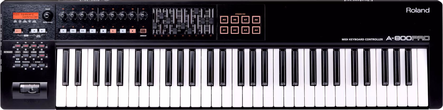 Roland A 800 Pro je kompaktní, 61klávesový MIDI/USB keyboard pro tvorbu samplů, MIDI a s dynamickou klaviaturou. Dostal opravdu intuitivní ovládání pomocí celkem 45 ovládacích prvků. Nechybí tu ani 8 dynamických padů pro ovládání rytmiky prsty, je tu i modulační joystick a samozřejmě je možné dokoupit pedály Sustain a Expression. Celý keyboard je také možné napájet přes rozhraní USB.