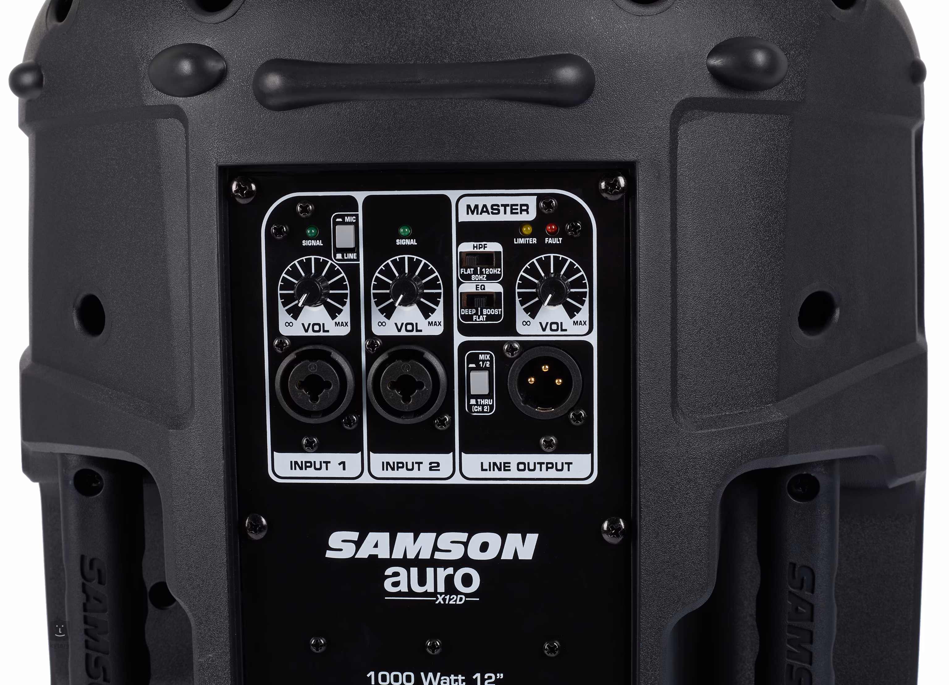 Zadná strana ponúka dva kombinované vstupy XLR/Jack s vlastným ovládaním hlasitosti a jeden výstup XLR s prepínačom Mix/Thru na ďalšie prepojenie reproduktorov. Nájdete tu aj ovládač Master Volume, prepínač Mic/Line pre prvý kanál alebo trojstupňové prepínače HPF a EQ na dosiahnutie najlepšieho výstupného signálu. Na bočnej strane sú ergonomické rukoväte na pohodlné prenášanie. Auro X12D možno umiestniť na stojan alebo môžete použiť skosený tvar na počúvanie pod uhlom tridsať a šesťdesiat stupňov.