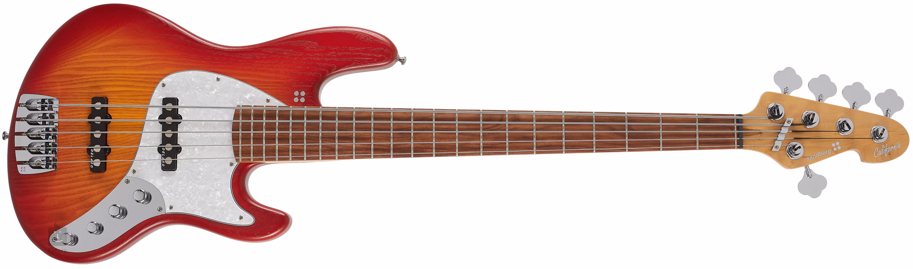 Telo päťstrunovej basgitary Sandberg California TT 5 PF Cherry Sunburst je vyrobené z jaseňa. Ku krku z kanadského javora je prilepený hmatník z pau ferro s dvadsiatimi dvoma pražcami. Krk je k telu priskrutkovaný šiestimi skrutkami a pevne drží v úplne presnej polohe.