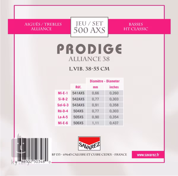 Savarez chce mladým virtuózom poskytnúť najvyššiu kvalitu už od prvých hodín hry na gitare. Práve preto vznikla séria strún Prodige, ktorá ponúka kvalitné struny pre menšie klasické gitary. Táto sada je určená pre 1/2 gitary s menzúrou 38-55 cm. Vyššie struny sú vyrobené z fluorokarbónového materiálu Alliance, ktorý poskytuje výnimočne čistý tón, zatiaľ čo basové struny sú vyrobené z materiálu HT Classic, ktorý im dodáva pevný a jasný zvuk s bohatým harmonickým obsahom. Výsledkom sú frekvenčne vyvážené struny s presnou intonáciou, na ktoré sa pohodlne hrá. Jednoducho vrchol medzi strunami.