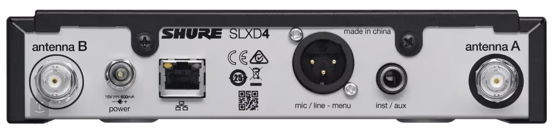 SLXD4 je bezdrôtový prijímač s dosahom až 100 metrov v priamom výhľade. Je veľmi jednoduchý na nastavenie a poskytuje stabilný a spoľahlivý prenos zvuku. Automatické IR párovanie zabezpečuje jednoduché pripojenie k vysielaču. Prijímač je vybavený výstupmi XLR a 6,3 mm TRS na zadnej strane. Port Ethernet sa používa na sieťové pripojenie k iným komponentom zo série SLXD. Prijímač je možné namontovať do racku.