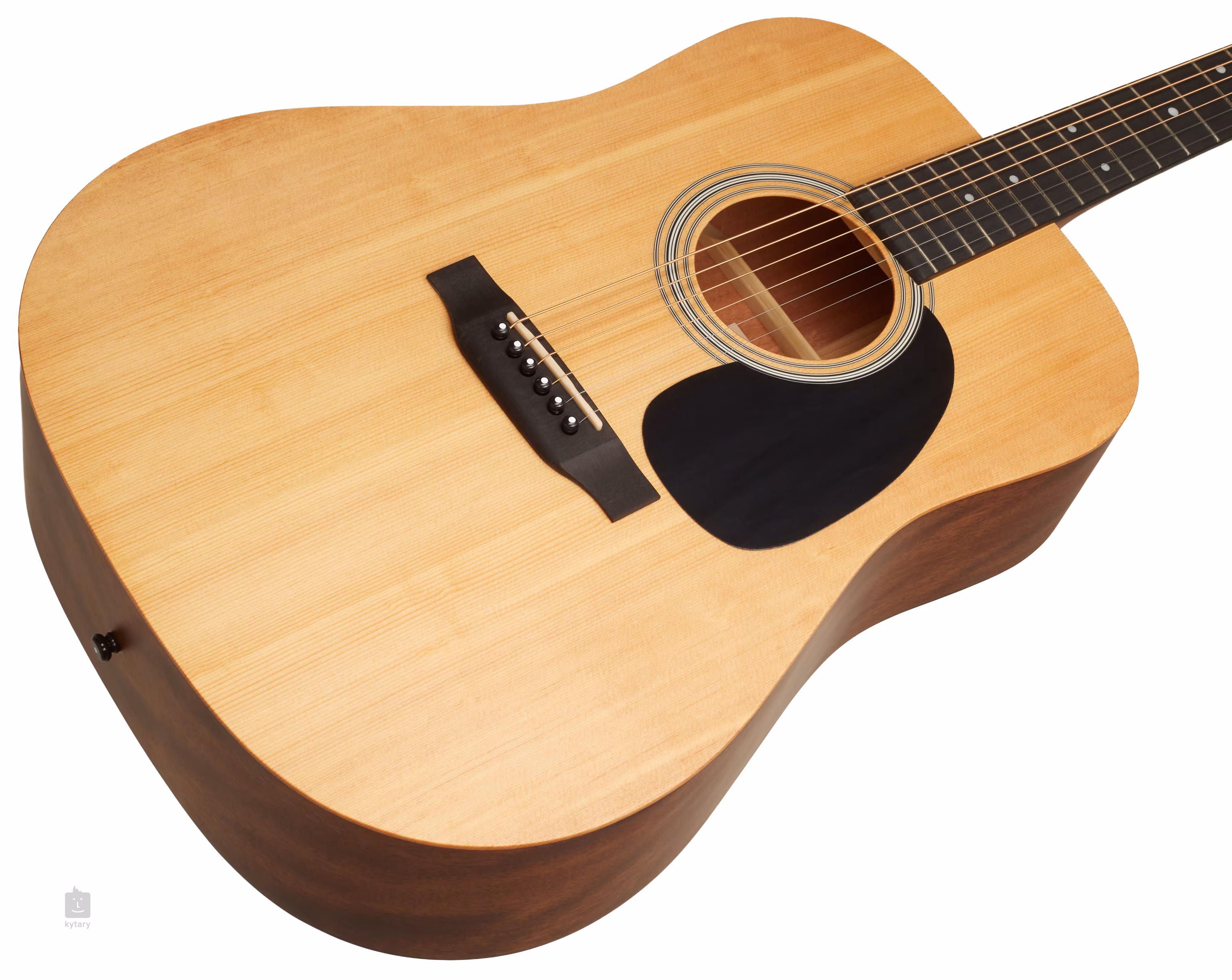 Táto gitara Dreadnought je postavená veľmi úsporne, takže v nej nenájdete žiadne doplnky, ktoré by zbytočne zvyšovali cenu. Prírodná povrchová úprava a matný lak umožňujú zvuku dýchať, vďaka čomu je veľmi otvorený. Gitara má prednú dosku z masívneho smreka Sitka a zadnú dosku a luby z mahagónu.