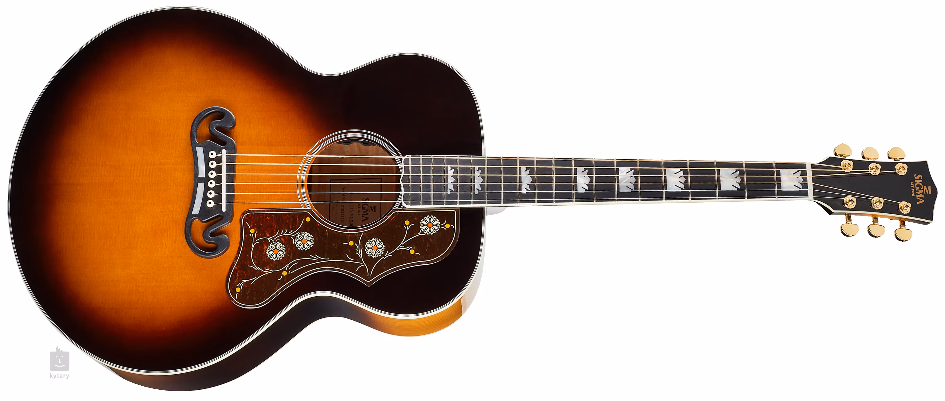 Tento nádherný model GJA-SG200 má polomasívne telo typu Grand Jumbo, ktoré produkuje mohutný a silný tón. Rezonančná doska je vyrobená z masívneho smreka, zatiaľ čo luby a zadná strana sú z laminovaného plamienkového javora. Na výrobu krku bol tiež použitý javor a povrch hmatníka z kompozitného materiálu micarta je rozdelený dvadsiatimi pražcami a ozdobnými polohovými značkami v dizajne korunky.