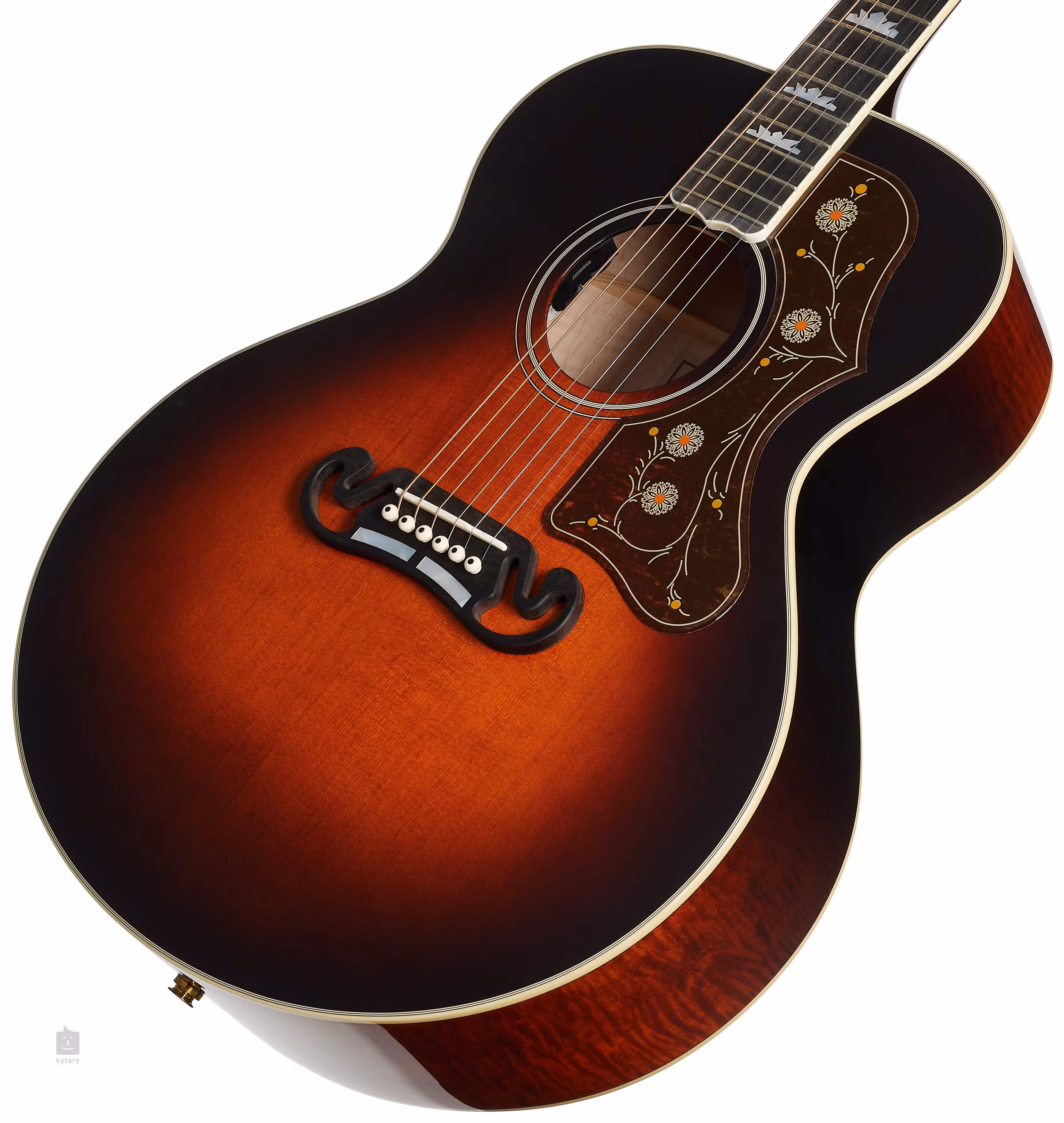 Struny sú osadené mechanikami Grover Die-Cast v zlatom prevedení a ebenovým hmatníkom. Nultý pražec a kompenzované kostené sedlo zaručujú ideálny prenos vibrácií strún. Nádherné spracovanie podčiarkuje lesklá leštená povrchová úprava tela, pickguard zdobený grafickými motívmi známymi z modelov Gibson SJ-200, hmatník v tvare fúzov, obojstranná obvodová väzba tela, dekorácia zadnej dosky a logo spoločnosti a perleťový motív na hlavici.