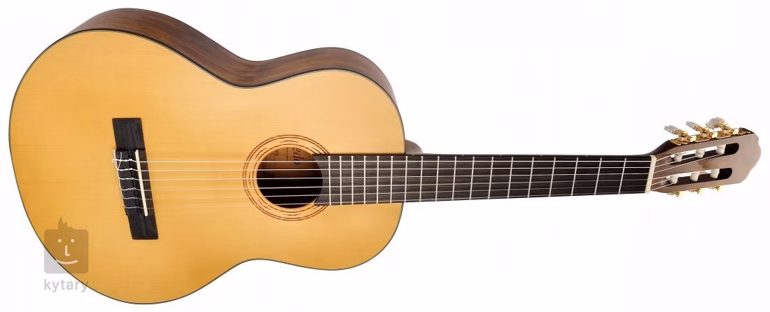 Struny sú uchytené v klasických ladiacich mechanikách v zlatom prevedení a palisandrovom hmatníku. Štýlovú povrchovú úpravu podčiarkuje matný vrchný lak, ručne nanesený lak na zadnej strane a luboch a čierne obvodové lemovanie.