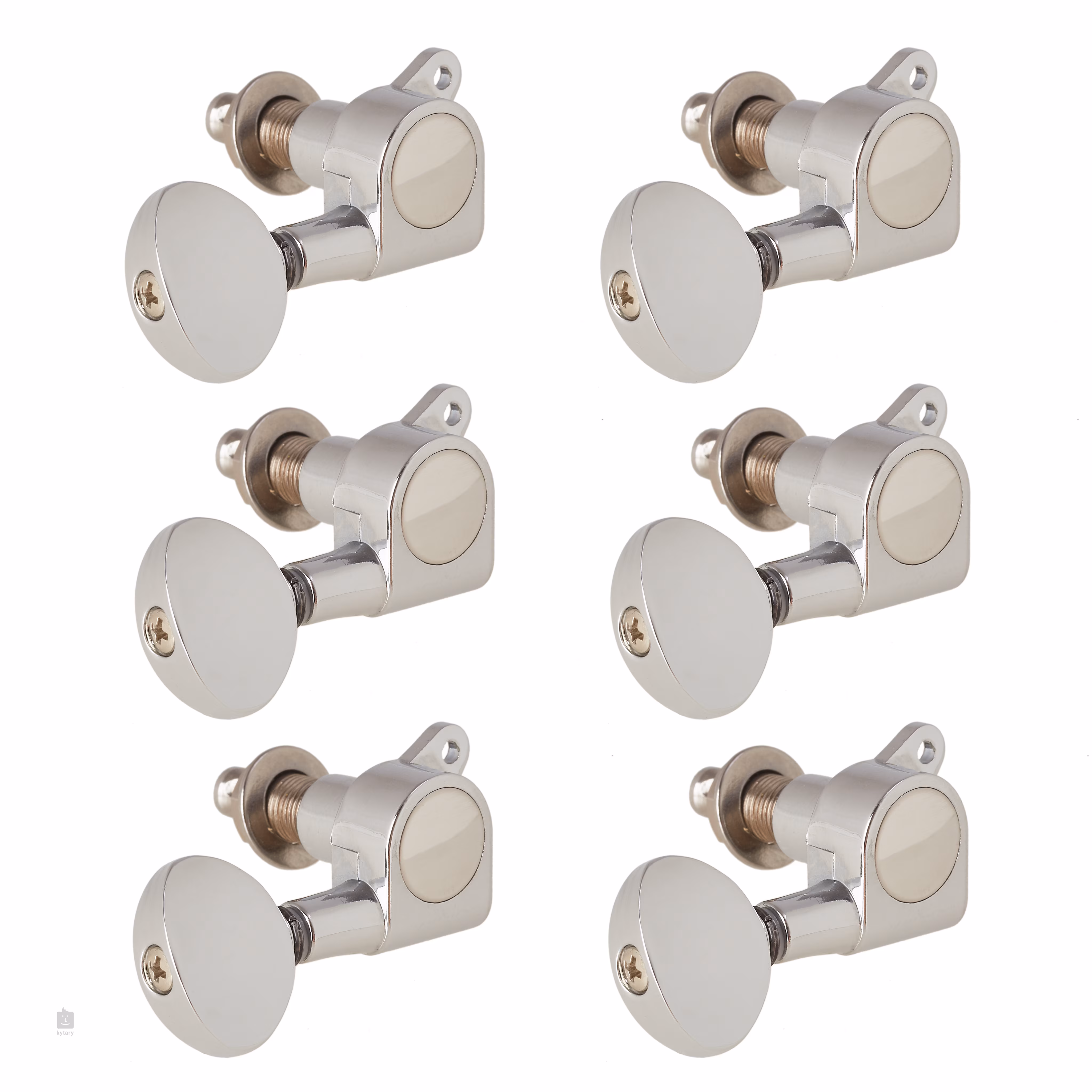 Sada chrómových ladičiek pre elektrickú gitaru. Balenie obsahuje šesť kusov (šesť za sebou).