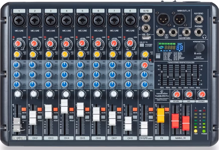 YOUMIX 810 PRO je ideálnou voľbou pre tých, ktorí hľadajú najvýkonnejší kompaktný mixér s USB, Bluetooth a efektmi v ponuke Soundsation.