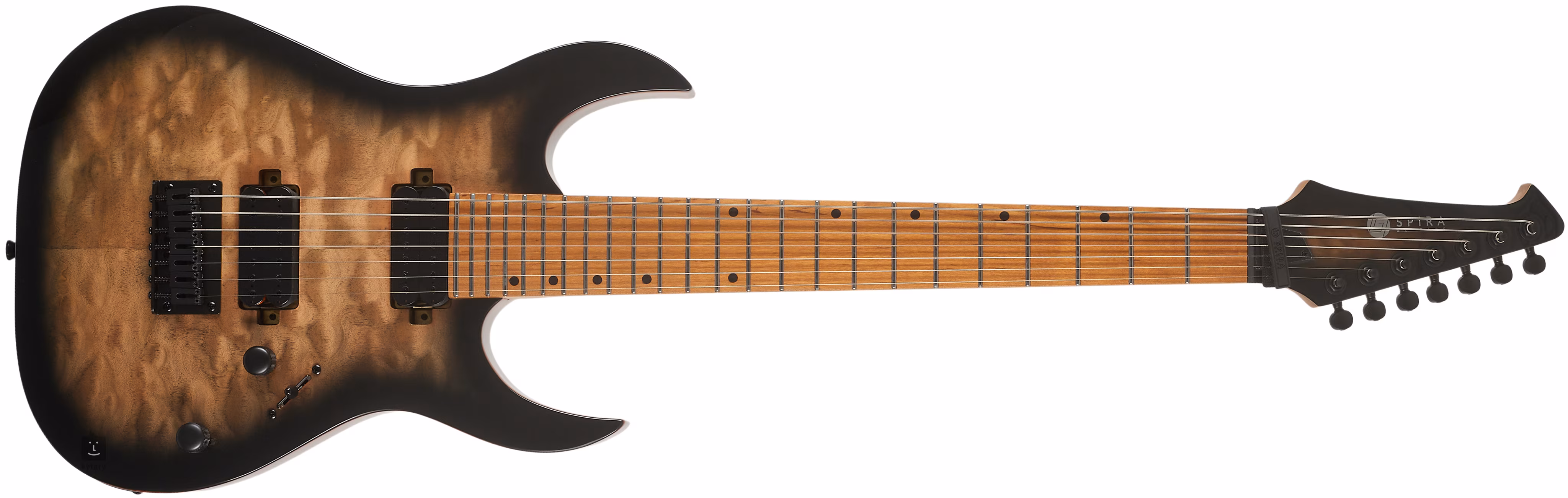 Spira Guitars S-507 QDS Limited je cenovo dostupná sedemstrunová elektrická gitara z limitovanej série tejto značky, určená pre hráčov súčasných hudobných štýlov, ktorí používajú nižšie ladenie – od moderného rocku a metalu po metalcore, djent a iné subžánre. Mahagónové telo gitary zdobí atraktívna vrchná vrstva z vlnitého javora. Krk je tiež vyrobený z javora s pohodlným profilom „Modern D“ a hmatníkom vybaveným dvadsiatimi štyrmi jumbo pražcami. Vďaka tepelnej úprave je drevo krku a hmatníka stabilnejšie.
