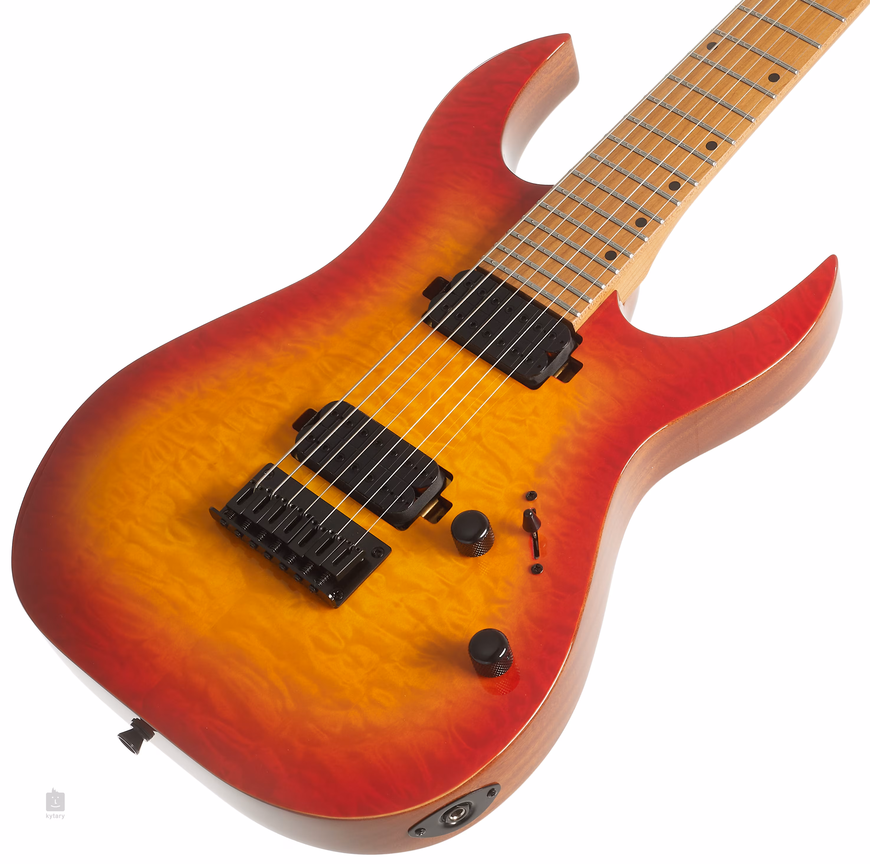 Spira Guitars S-507 QFB je cenovo dostupná sedemstrunová elektrická gitara s moderným dizajnom Super ST pre hráčov súčasných hudobných štýlov, ktorí pracujú s nižším ladením - od moderného rocku a metalu až po metalcore, djent a ďalšie subžánre. Mahagónové telo gitary zdobí efektná vrchná dýha z plamenného javora a lesklá lakovaná povrchová úprava. Ku krku z kanadského javora s profilom "Modern D" je prilepený javorový hmatník osadený dvadsiatimi štyrmi pražcami veľkosti jumbo. Vďaka tepelnej úprave javorového krku a hmatníka je drevo stabilnejšie.