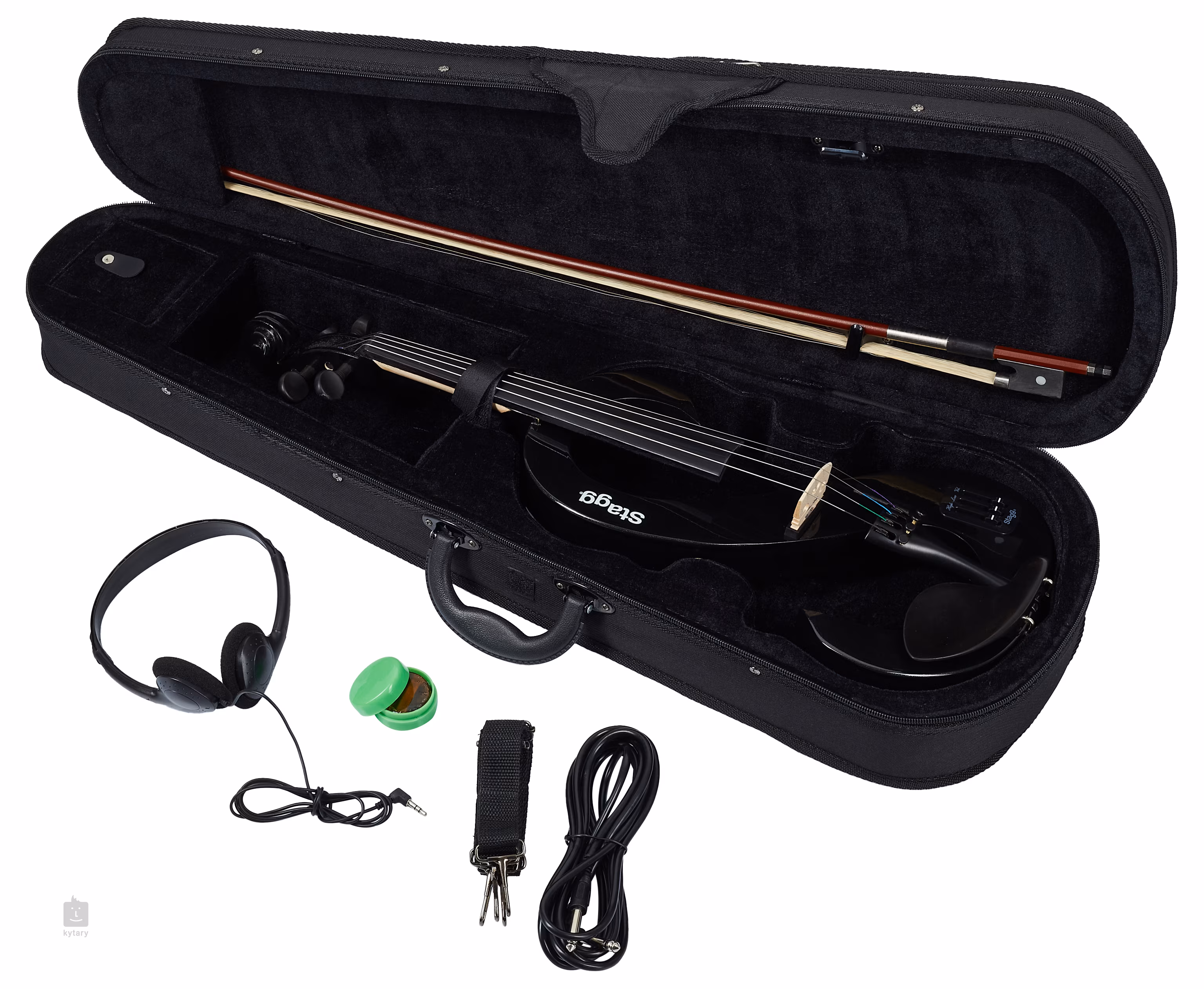Stagg 4/4 elektrické husle. Telo je vyrobené z masívneho javora, nástroj je vybavený piezoelektrickým snímačom a aktívnym predzosilňovačom.Husle sú tiež vybavené ovládačom hlasitosti, 2-pásmovým ekvalizérom a výstupom na slúchadlá. Tieto krásne husle s odvážnym dizajnom dostanete vrátane puzdra, sláčika, kalafuny, slúchadiel a 9V batérie.