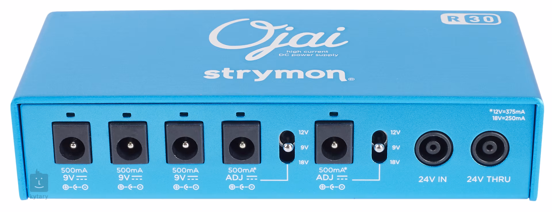 Strymon Ojai R30 je veľmi dobre spracovaný multiadaptér pre efektové pedále, ktorý vychádza z predchádzajúceho modelu Strymon Ojai. Má päť izolovaných výstupov - sedem štandardných s napätím 9 V (max. 500 mA) a dva s voliteľným napätím 9, 12 alebo 18 V (max. 500 mA). Čistý analógový obvod s dvojitou izoláciou (transformátor pre každý kanál) zaručuje ultranízky šum. Ojai možno použiť aj ako rozširujúcu jednotku k adaptéru Zuma alebo z neho napájať ďalšie jednotky a vytvoriť tak modulárny napájací systém.