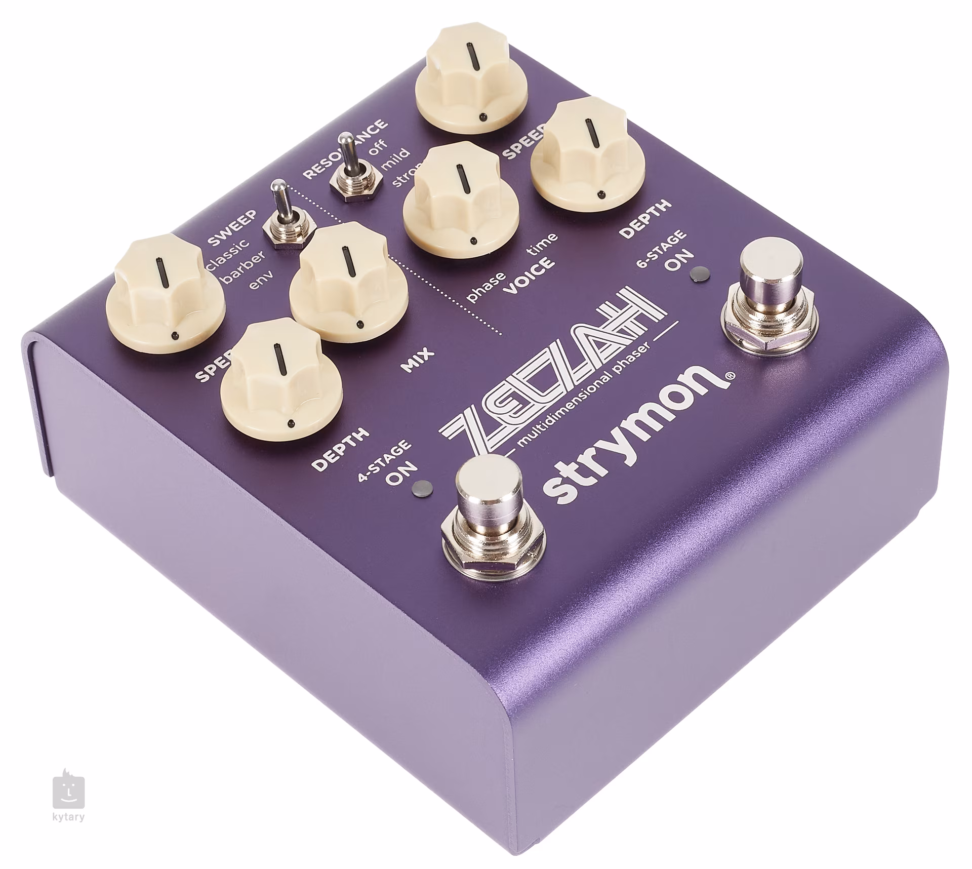 Pedálový efekt Strymon Zelzah ponúka dva nezávislé phaser efekty v jednom šasi so štyrmi a šiestimi filtrami, vďaka čomu získate prémiové zvuky vintage phaser efektov a široké možnosti modifikácie/modulácie. 4-stupňový phaser sa pohybuje od klasických zvukov phaser efektu až po vibrato efekty a moduláciu siahajúcu až do oblasti harmonického tremola. Šesťstupňový phaser k efektu phaser pridáva flanger, chorus a všetko medzi tým. Obe strany/fázovače možno používať samostatne alebo súčasne a kombináciou rôznych efektov vytvárať úplne nové a pôsobivé modulačné zvuky a zvukové krajiny.