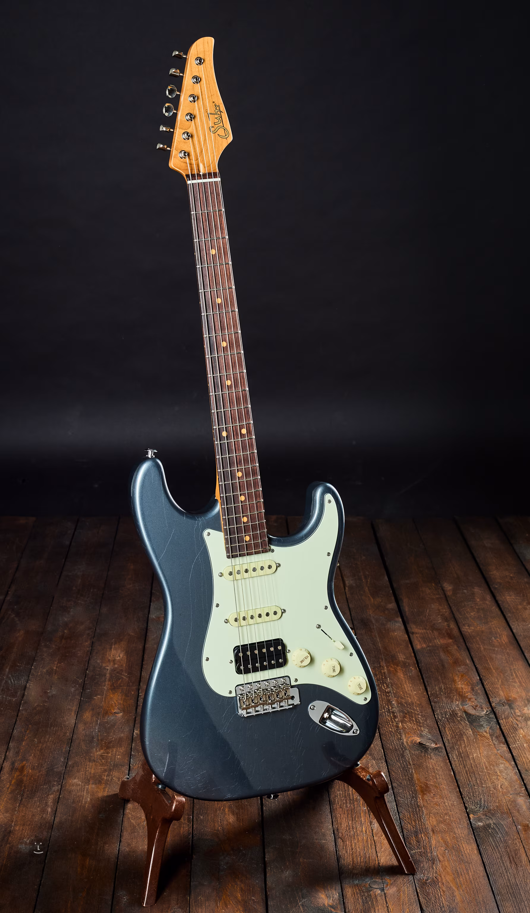Suhr Limited Edition Classic S Vintage HSS Charcoal Frost je elektrická gitara z limitovanej série Classic S Vintage. Je vybavená trojdielnym telom z jelše pokrytým lakom s úplne jemnými prvkami starnutia/ľahkého starnutia. Pražený javorový krk s profilom 60's C Vintage Standard (.810"-.930") je prilepený k palisandrovému hmatníku osadenému strednými niklovými pražcami (Medium Nickel .055 "x.090"). Zložený rádius hmatníka (9-12 palcov) zaručuje skvelú hrateľnosť a povrchovú úpravu po celej ploche hmatníka.