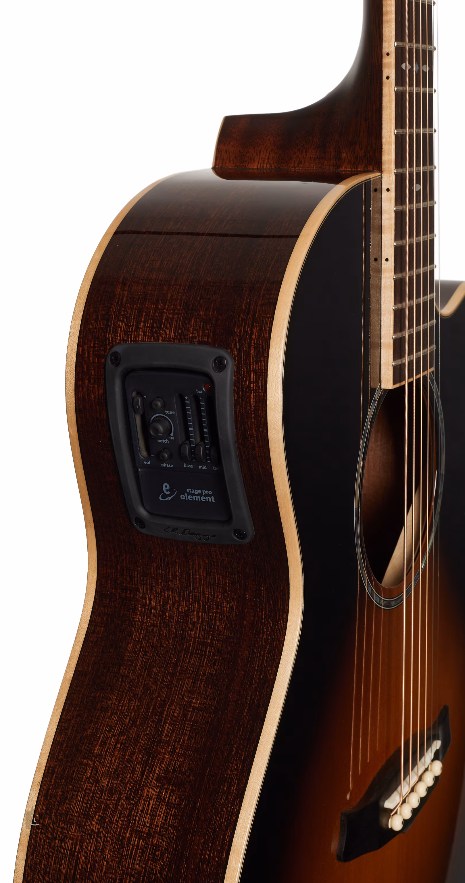 Možnosti ozvučenia zahŕňajú elektroniku LR Baggs Stage Pro Element s trojpásmovým ekvalizérom a vstavanou ladičkou. Struny sú uchytené v ladiacich mechanikách a palisandrovom hmatníku prostredníctvom kosteného pražca a sedla. Pekné spracovanie podčiarkuje vrchná farebná úprava Vintage Sunburst, logo spoločnosti na hlave a pickguard s imitáciou korytnačiny, ktorý zároveň chráni lak gitary.