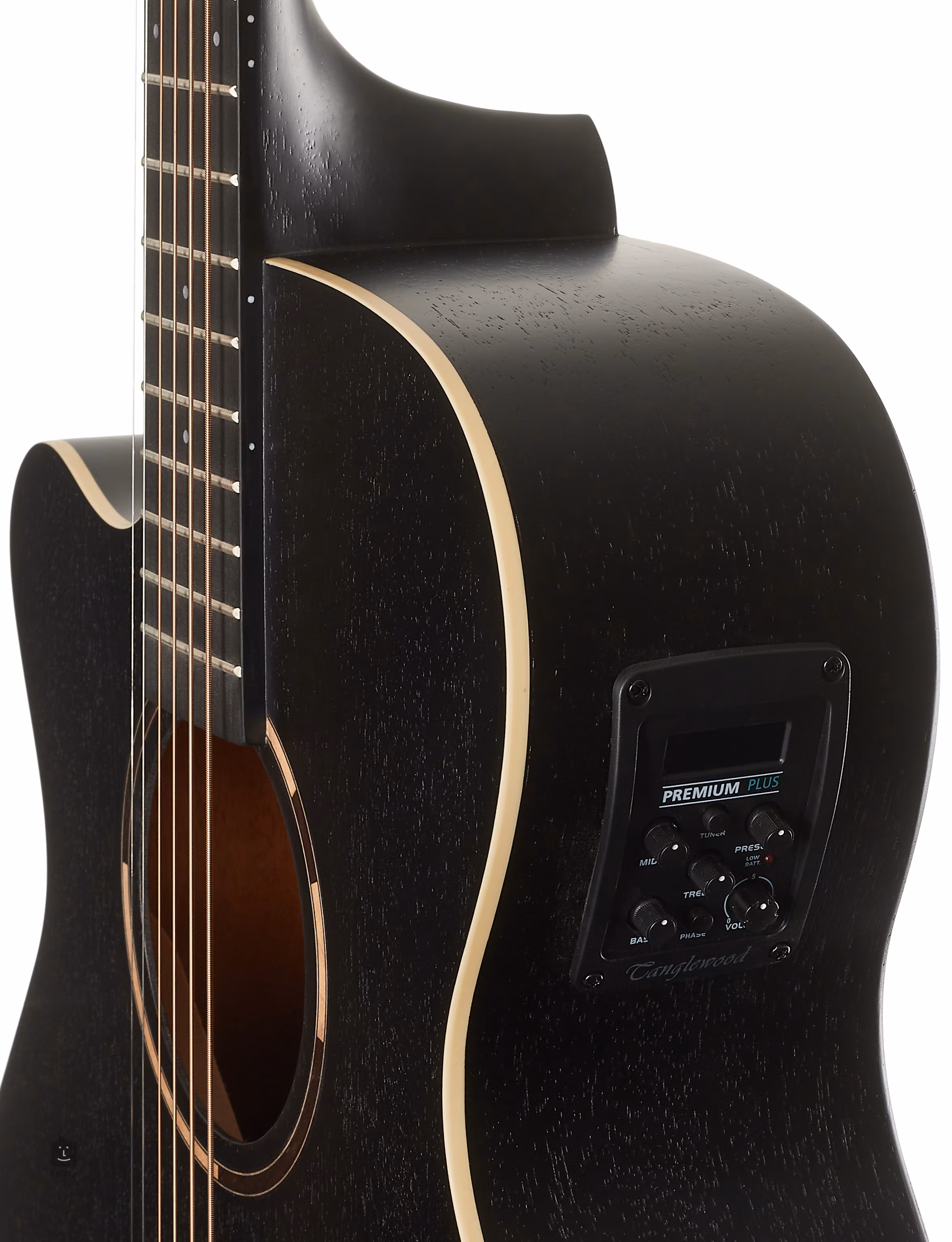 Tanglewood Blackbird TWBBSFCELH je elektroakustická gitara pre ľavorukých hráčov typu "Super Folk", t. j. nástroj s užším a plytším telom ako Dreadnought. Telo gitary je vyrobené z laminovaného afrického mahagónu. Mahagónový krk je prilepený k modernému kompozitnému hmatníku s 20 pražcami. Struny sú uchytené v chrómových liatych mechanikách a kompozitnej hlavici. Vintage dojem a pocit z nástroja podčiarkuje povrchová úprava vrchnej dosky Smokestack Black Satin.