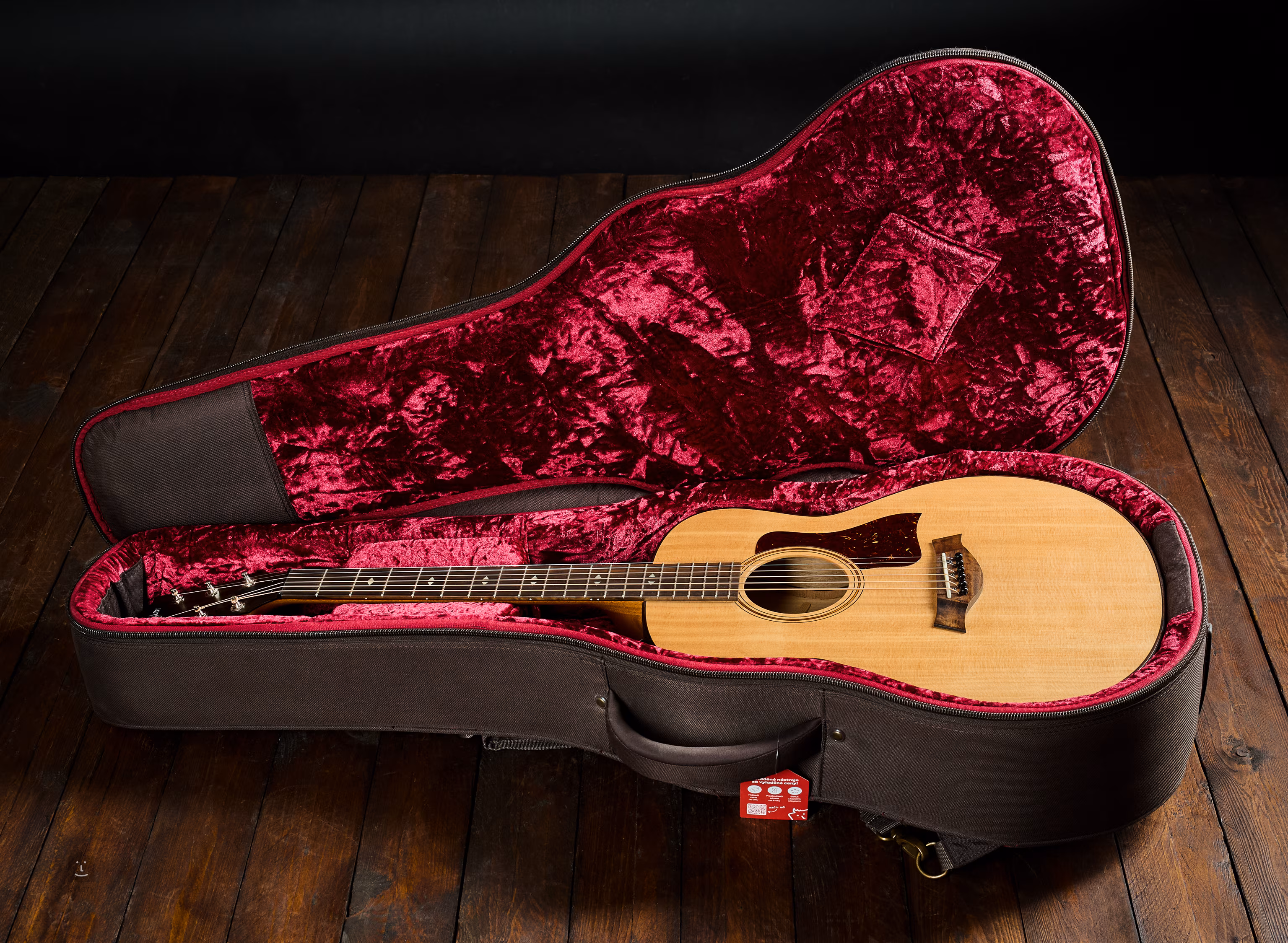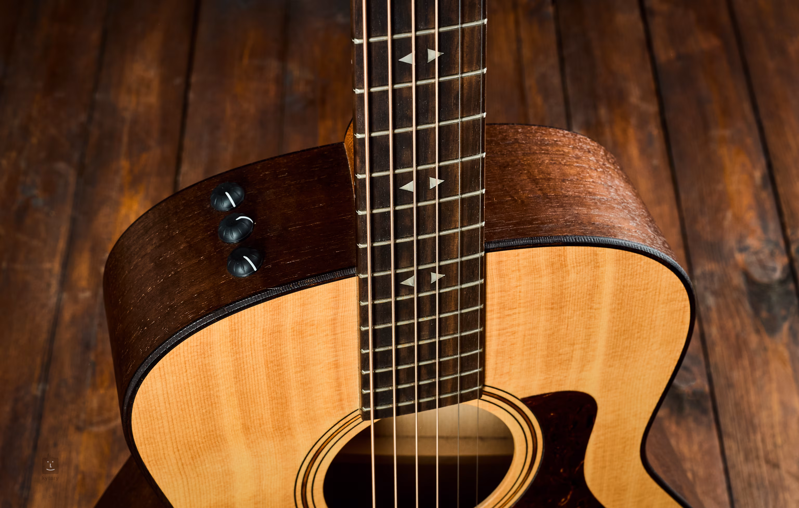 Moderný americký celomasívny Taylor s kratšou menzúrou a kompaktným telom, ktorý stále ponúka veľký rezonujúci akustický zvuk.