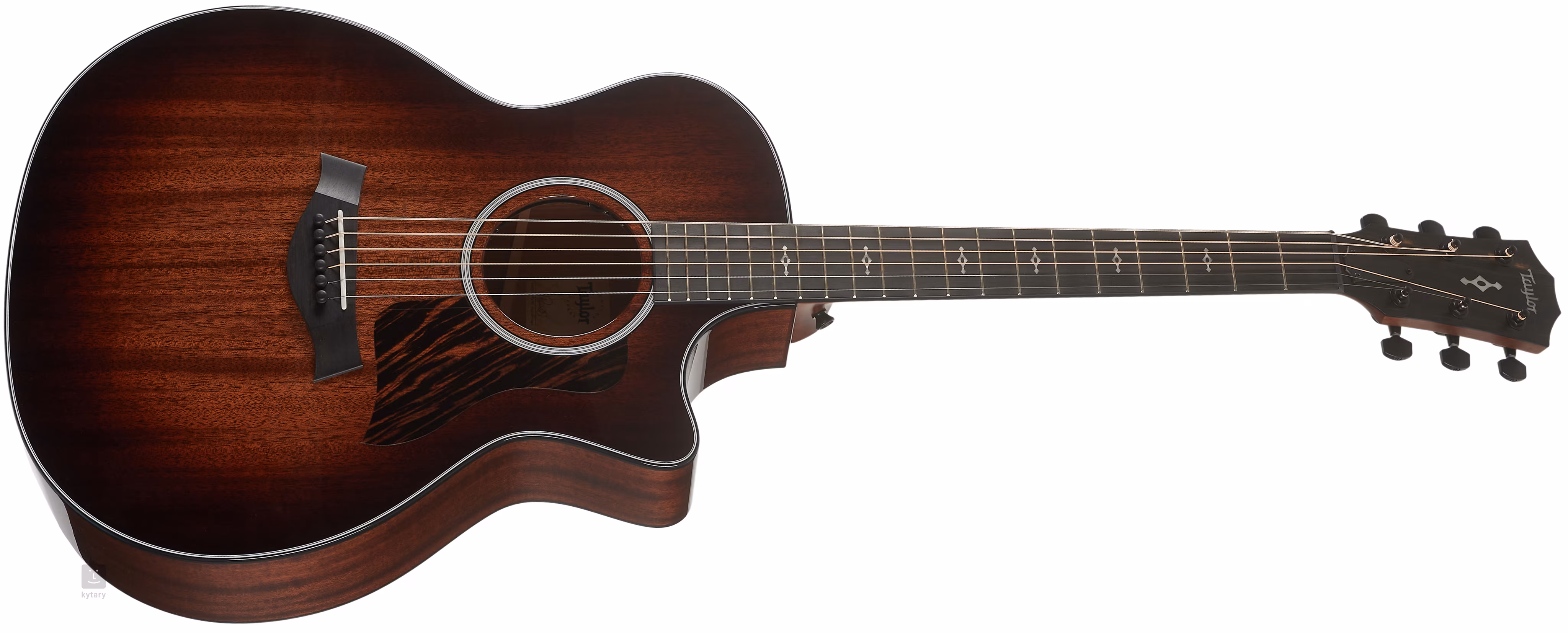 Štýlový povrch zdôrazňuje vrchná doska Shaded Edgeburst, čierne ladiace mechaniky Taylor, čierne lemovanie tela s čierno-bielou intarziou, ebenová dyha na hlave a chránič strún s ohňovým pruhom.