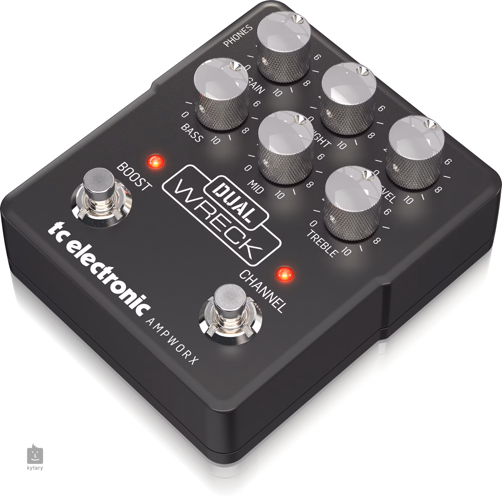 TC Electronic DUAL WRECK Preamp je dvojkanálový predzosilňovač vo formáte pedálového efektu, ktorý verne zachytáva zvuk duálneho usmerňovača Revision G. Je vybavený dvoma kanálmi Green (Crunch) a Red (Lead/High Gain), ktoré spoľahlivo pokrývajú spektrum zvukov rockovej a metalovej hudby, štvorpásmovým ekvalizérom (Bass, Mid, Treble, Presence), potenciometrom Tight na nastavenie/vyrezanie basových frekvencií pred preampom/EQ a ovládačom výstupnej úrovne. Nastavenie kanála sa pri prepnutí automaticky uloží.