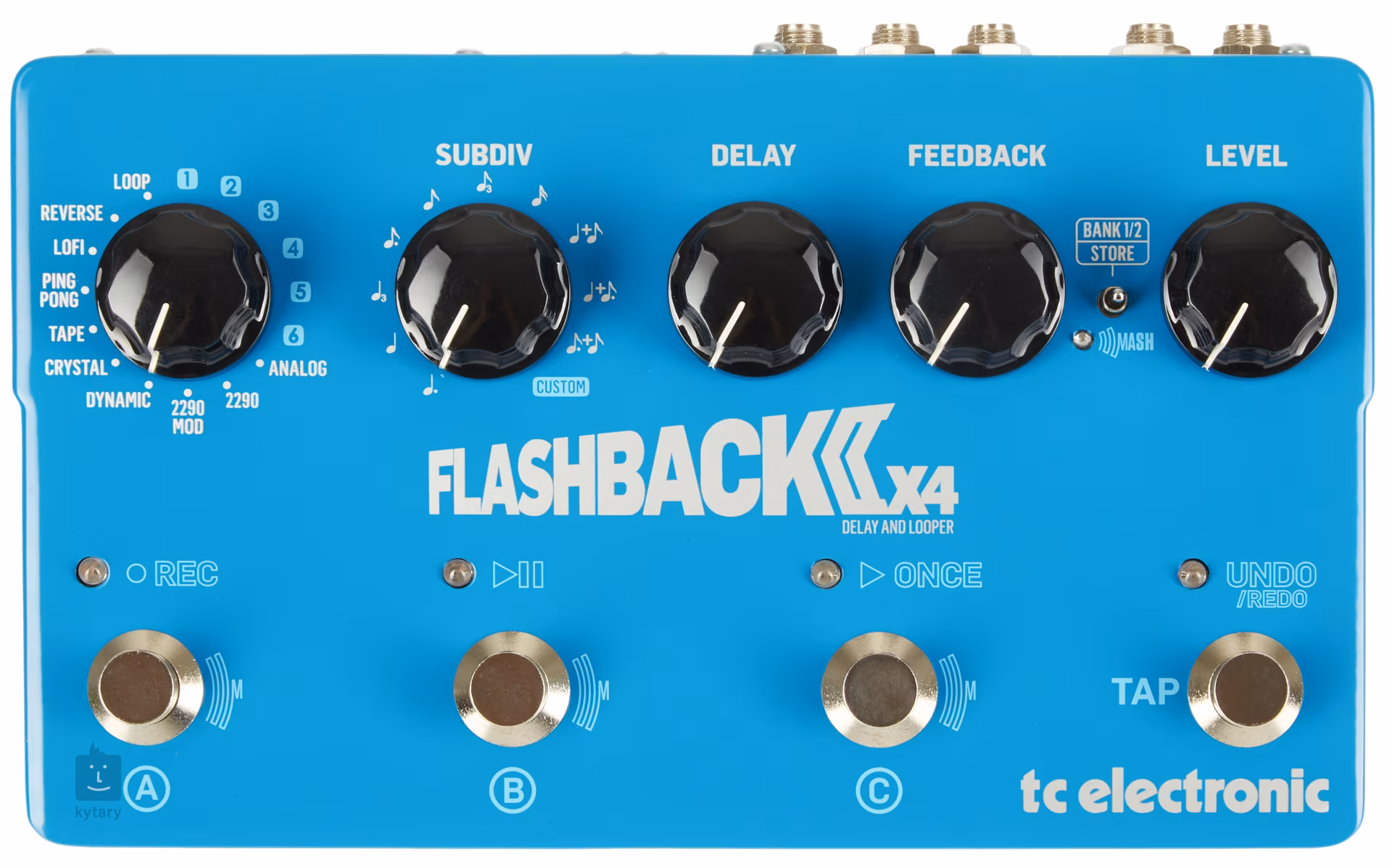 Flashback 2x4 Delay je vlajková loď pedálových efektov dánskej značky TC Electronic. Ponúka 9 vysokokvalitných delay efektov, looper so 40 sekundami nahrávania, šesť presetových/efektových slotov z knižnice aplikácie TonePrint (na stiahnutie zadarmo), funkciu tap tempo s nastavením rýchlosti frázovania delay efektu pomocou rytmických subdivízií (11 rôznych nastavení), nožný spínač s revolučnou funkciou MASH, mono/stereo pripojenie, MIDI kompatibilitu, vstup pre expression pedál a ďalšie skvelé vlastnosti.