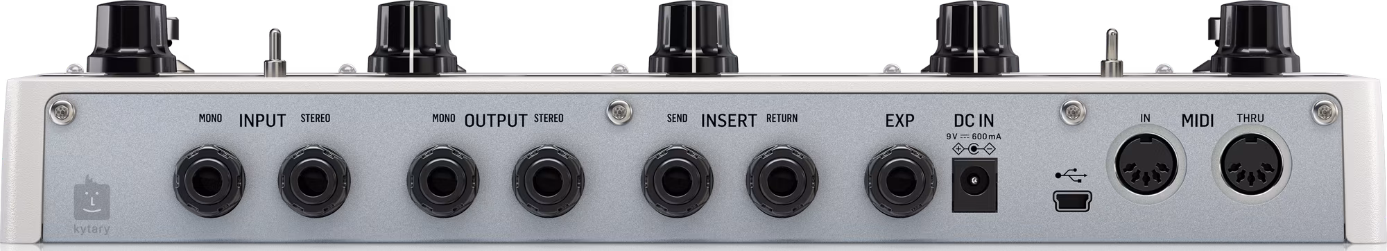 Na zadnom paneli okrem štandardných voliteľných stereo/mono pripojení nájdete aj MIDI na ovládanie multiefektov pomocou externého zariadenia, USB rozhranie na aktualizáciu firmvéru, efektovú slučku na integráciu vašich obľúbených krabičiek a vstup pre externý expression pedál. PLETHORA X5 je zapojená ako true bypass. Súčasťou balenia je 9V adaptér na napájanie.