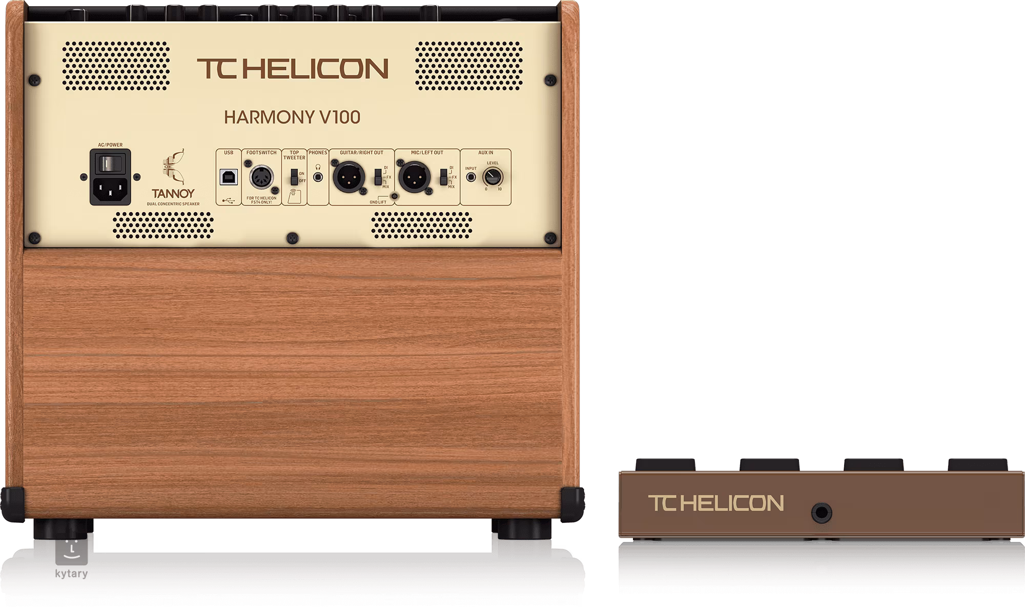 TC Helicon HARMONY V100 je dvojkanálové kombo pre akustické nástroje s zosilňovačom triedy D a výkonom 100 W, vokálnym procesorom, looperom, dvojitým koncentrickým reproduktorom a štvorkanálovým nožným prepínačom.