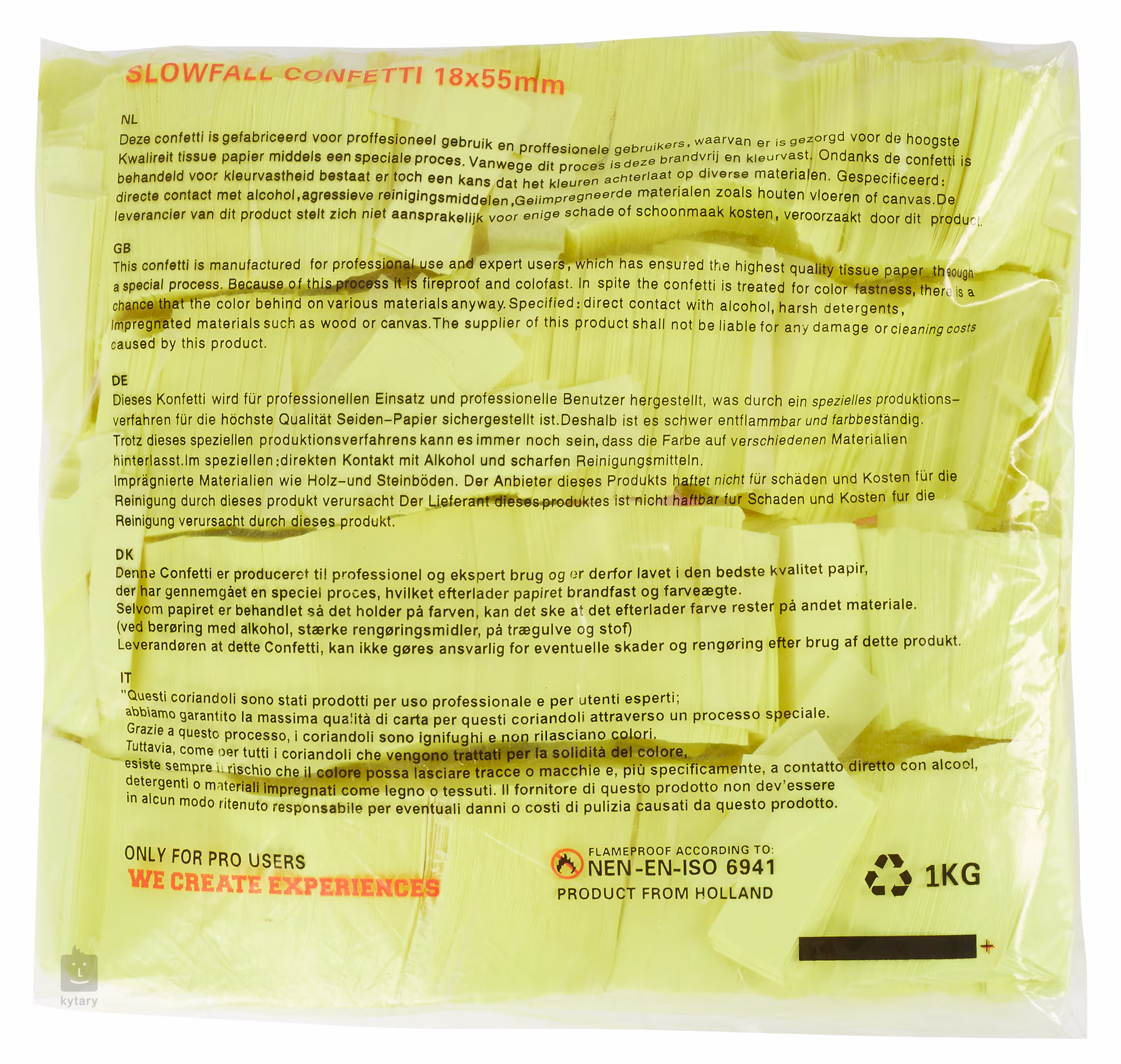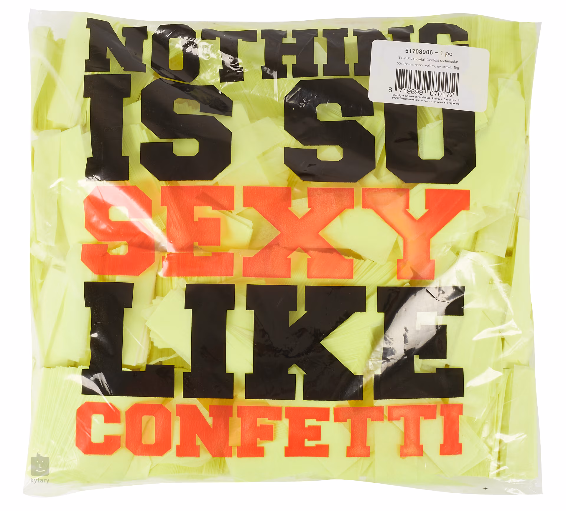 Konfety sa stali neoddeliteľnou súčasťou každého živého vystúpenia, diskotéky alebo detskej narodeninovej oslavy. Tieto pomaly padajúce konfety majú neónovo žlté pruhy s rozmermi 18 x 55 mm, vystreľovacia trubica nie je súčasťou balenia.