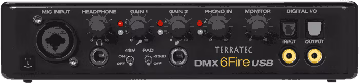 Splňuje náročné požadavky na zvukovou kvalitu, takže DMX 6Fire USB se perfektně hodí jako externí audio systém pro muzikanty, DJ i hráče počítačových her. Neoficiálního předchůdce (DMX 6Fire 24/96) jsme kompletně přepracovali a dosáhli zcela nových vlastností: Namísto PCI rozšiřující karty je nyní vybaven USB 2.0 jackem. Namísto 24 bitů/ 96kHz, má nyní 24 bitů/ 192kHz.
