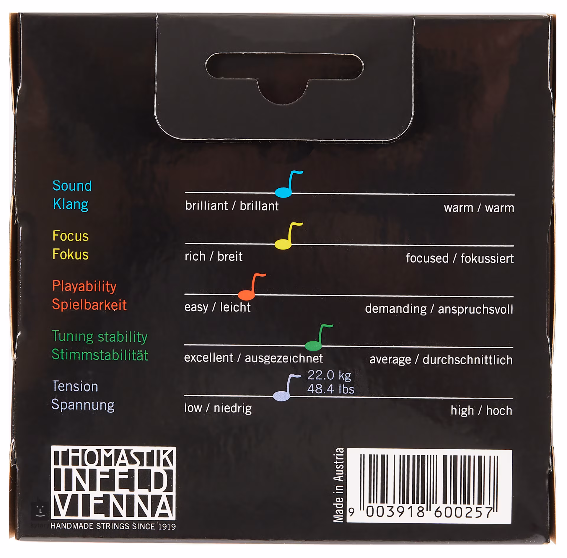 Struny Thomastik Dominant ponúkajú hudobníkom výhody používania syntetického jadra. Ich tón je teplejší a pri hre majú podobný pocit ako pravé črevné struny. Okrem toho sú však úplne odolné voči zmenám vlhkosti a teploty, vďaka čomu je ich ladenie mimoriadne stabilné. Zvuk je mäkší, čistejší a veľmi bohatý na harmóniu. Struny sú vhodné ako odrazový mostík pri hľadaní vášho charakteristického zvuku.