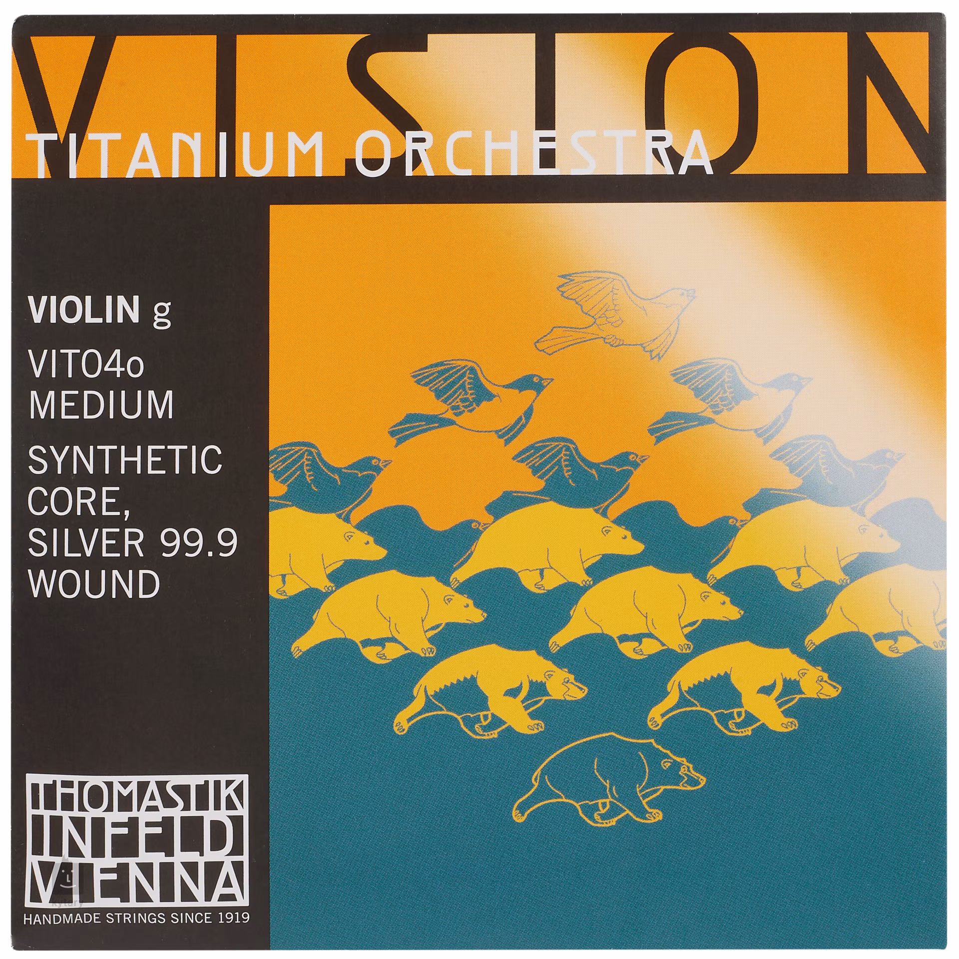 Husľové struny Thomastik Vision Titanium Orchestra majú jadro z pokročilého syntetického materiálu, ktorý zaručuje vynikajúcu odozvu sláčika. Tieto struny boli navrhnuté ako alternatíva k strunám z prírodných čriev a možno ich s nimi efektívne kombinovať. Ponúkajú plný a farebný tón, ktorý je ideálny na orchestrálnu a komornú hru, ale často ich používajú aj sólisti. Struny sa veľmi rýchlo usadzujú a ich ladenie zostáva stabilné. Sú zakončené guľôčkou, ktorá je vyrobená zo zliatiny Titanalu, čo prispieva k ich jedinečným vlastnostiam.