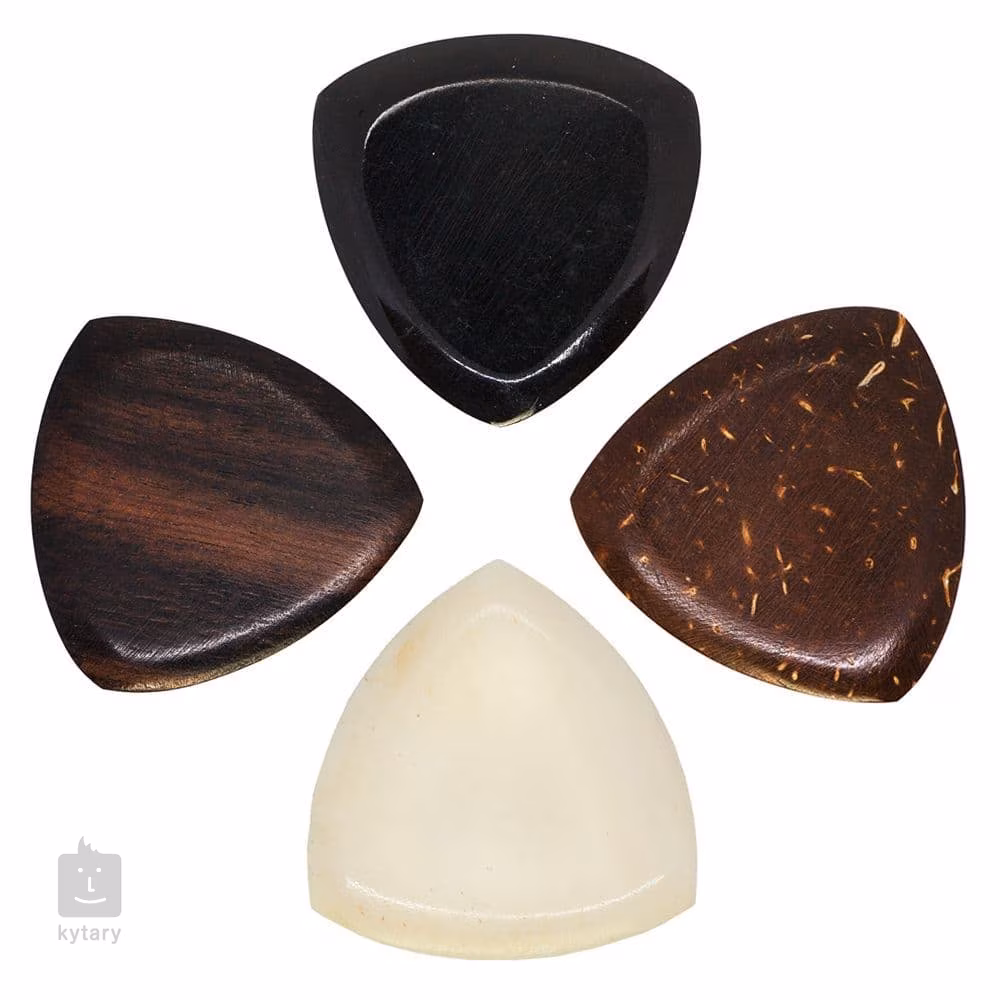 Či už hľadáte darček pre nadšeného gitaristu, alebo len hľadáte dokonalý zvuk a chcete vyskúšať trsátka z netradičných materiálov, v Timber Tones určite nájdete to, čo potrebujete. Séria Gypsy Tones je ideálna pre gitaristov, ktorí uprednostňujú tvrdé, pevné trsátka s veľkou úchopovou plochou. Majú rozmery 3 x 3 cm a hrúbku 3,5 mm. V tejto sade nájdete štyri trsátka z rôznych materiálov - africký eben a byvolia kosť sú tvrdé materiály, ktoré vynikajú prenikavým a zvonivým tónom. Kokosový orech a byvolí roh sú naopak mäkšie a majú teplejší zvuk.
